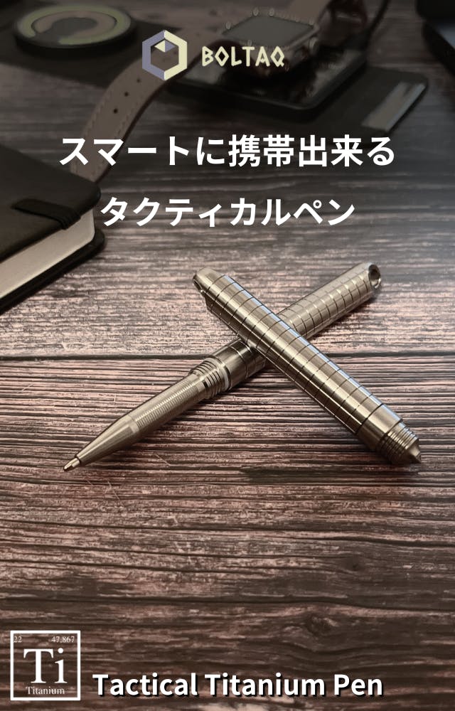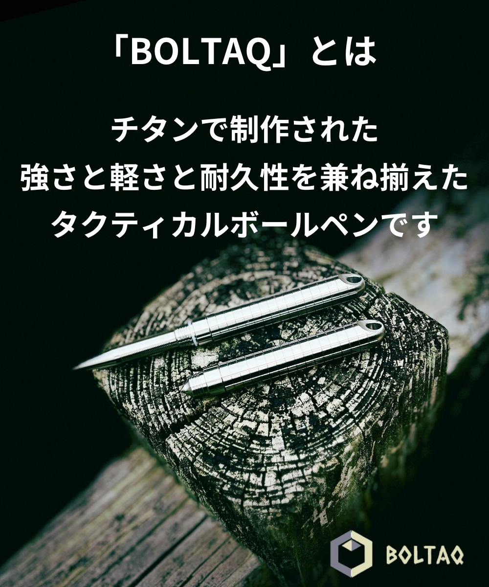 品質とデザインに優れたボルトアクション式チタンボールペン「BOLTAQ」を誇りを持ってご紹介します。「BOLTAQ」はチタン素材で軽量で強く耐腐食性があり、スムーズな書き心地と緊急時のガラスブレーカーを提供します。使いやすさとスタイリッシュなデザインが特徴で、日常生活を楽しく、特別なものにします。是非手に取って使ってください。