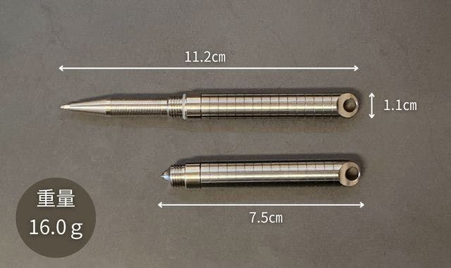 A:ボールペン時は長さ11.2 cm、直径1.1㎝です。ガラスブレーカー時は長さ7.5㎝、直径1.1㎝です。