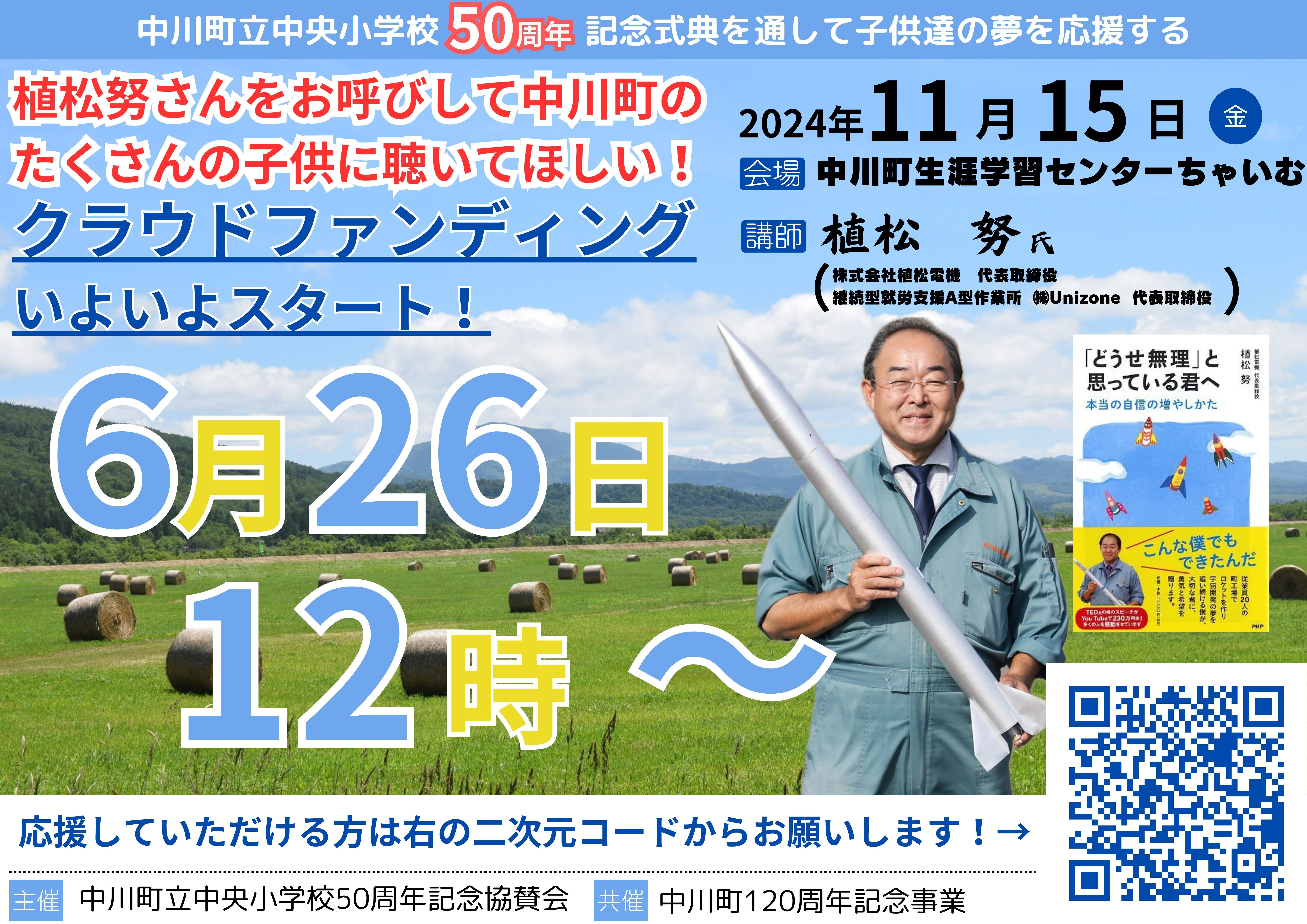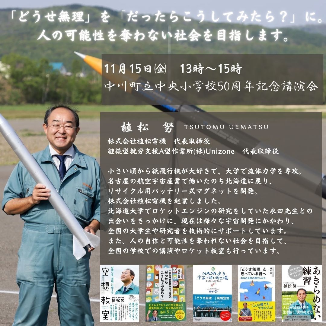 中央小学校の50周年記念式典は、中川町の未来を担う子どもたちにとって、新たな一歩を踏み出す貴重な機会となります。植松さんの講演を通じて、彼らが自分の夢や目標に向かって前進する勇気を持つことができるよう、皆様からの温かいご支援を心よりお願い申し上げます。