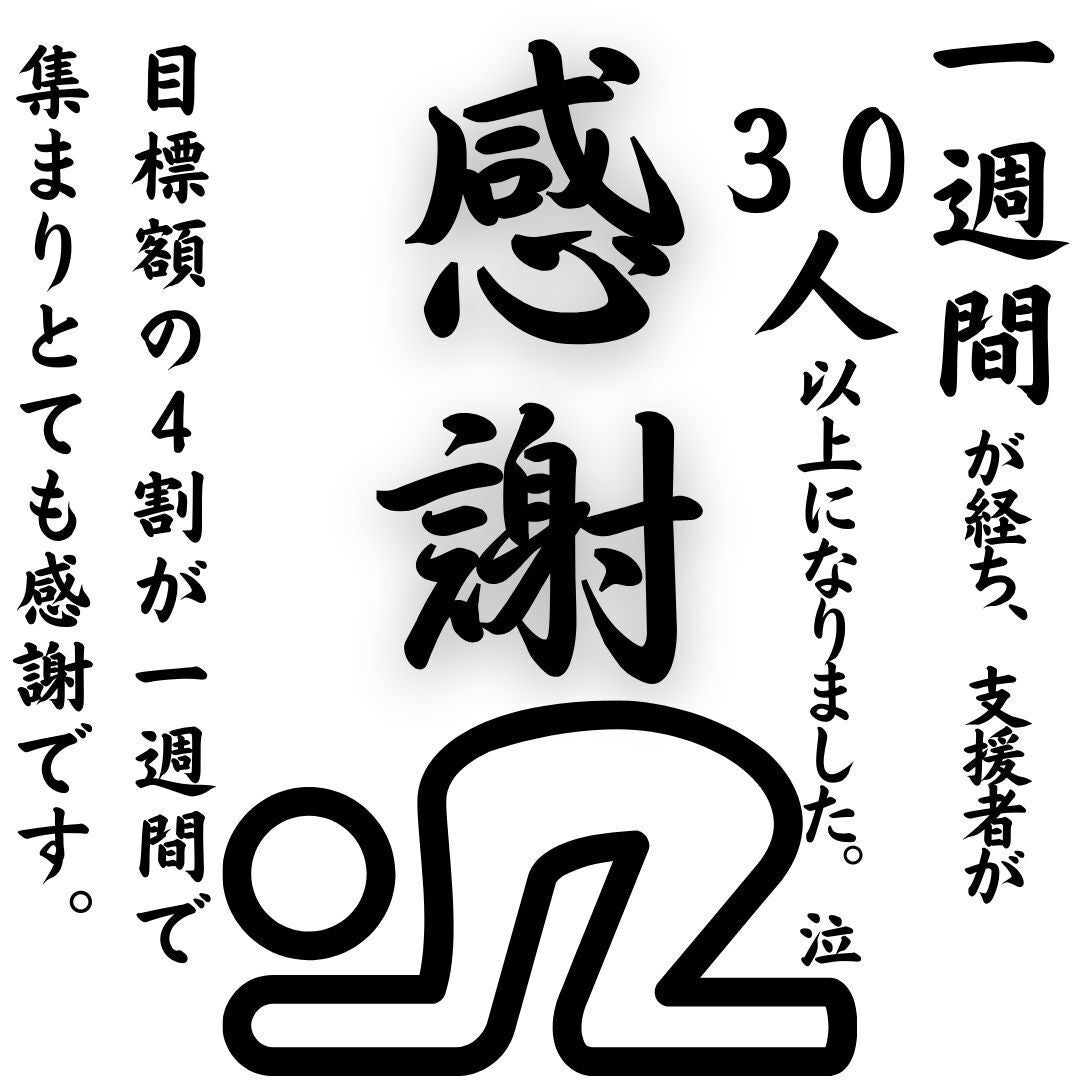2024/08/29 12:00支援者の皆様へこちらのクラウドファンディングも残り15日となりました。皆様、私たちのプロジェクトに対する熱いご支援、本当にありがとうございます。皆様の1人ひとりの力強い支援が、私たちの心に火を灯し、前に進む原動力となっています。このプロジェクトを始めたとき、私たちはただ夢を追いかけるだけではなく、その夢を現実に変えたいという強烈な情熱を持っていました。それは、私たちの人生において最も重要な挑戦であり、全てを賭けた挑戦です。しかし、どれだけ準備をしても、未来には予測不能な困難が待ち受けていることを痛感しました。そんな中で皆様の支援がどれほど私たちを奮い立たせたか、言葉では表しきれません。皆様の一つひとつのご支援、そして温かいメッセージの一つひとつが、私たちの胸に強烈に響き渡り、時には涙が出るほどの感動を覚えました。それは、私たちの夢だけではなく、皆様との共通の目標に向かって燃え上がる魂の共鳴だと感じています。私たちは皆様の期待を裏切らないよう、日々全力で取り組んでいますが、その過程で感じるのは、皆様からの応援がいかに私たちを強くし、奮い立たせるかということです。皆様の信頼は、私たちの背中を押し、どんなに厳しい瞬間でも立ち上がり続ける力を与えてくれます。このプロジェクトが成功することで、私たちはただ夢を実現するだけではなく、皆様と共に作り上げた新たな未来を創り出すことができるのです。私たちは、その未来に向かって、一緒に燃え上がることができる同志である皆様に心から感謝しています。今後とも、この熱い想いを共有しながら、共に歩んでいけることを心から楽しみにしています。皆様、本当に、本当にありがとうございます。これからもどうか、私たちを力強く支えてくださると幸いです。全力で、そして心から、皆様に感謝を申し上げます。現在57%。厳しい現実を受け止めながら少しずつでも前に。前に。進んでいきます。 もっと見る