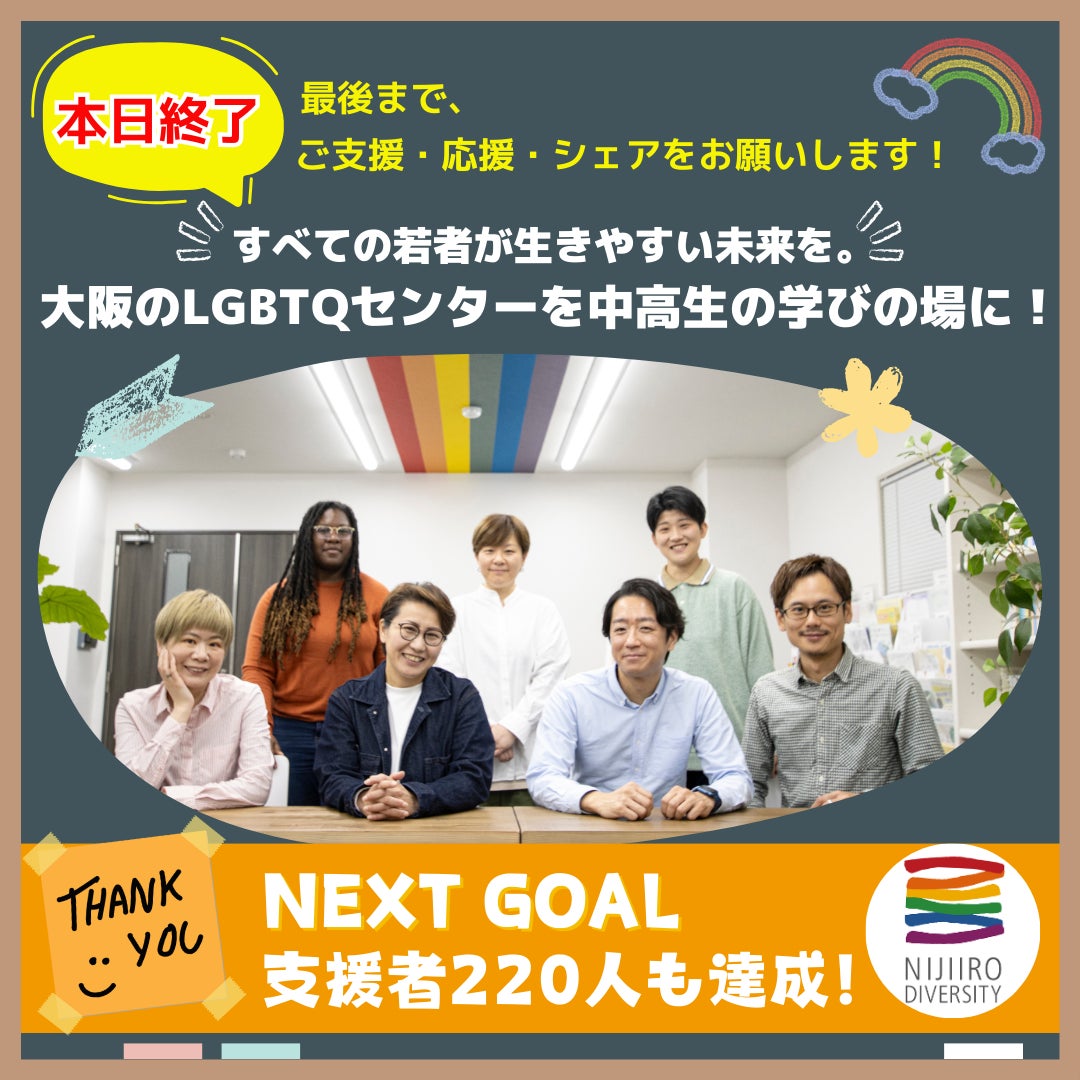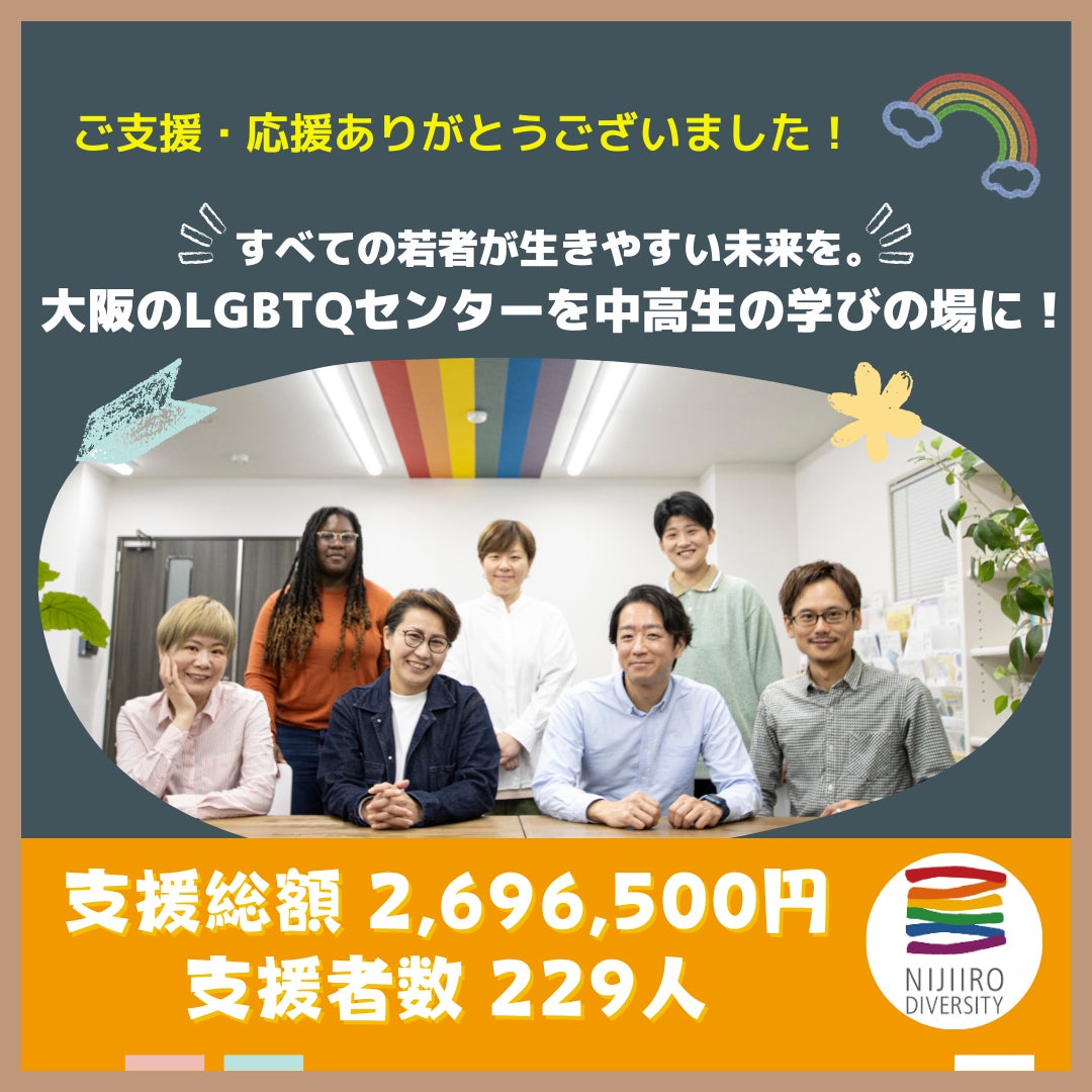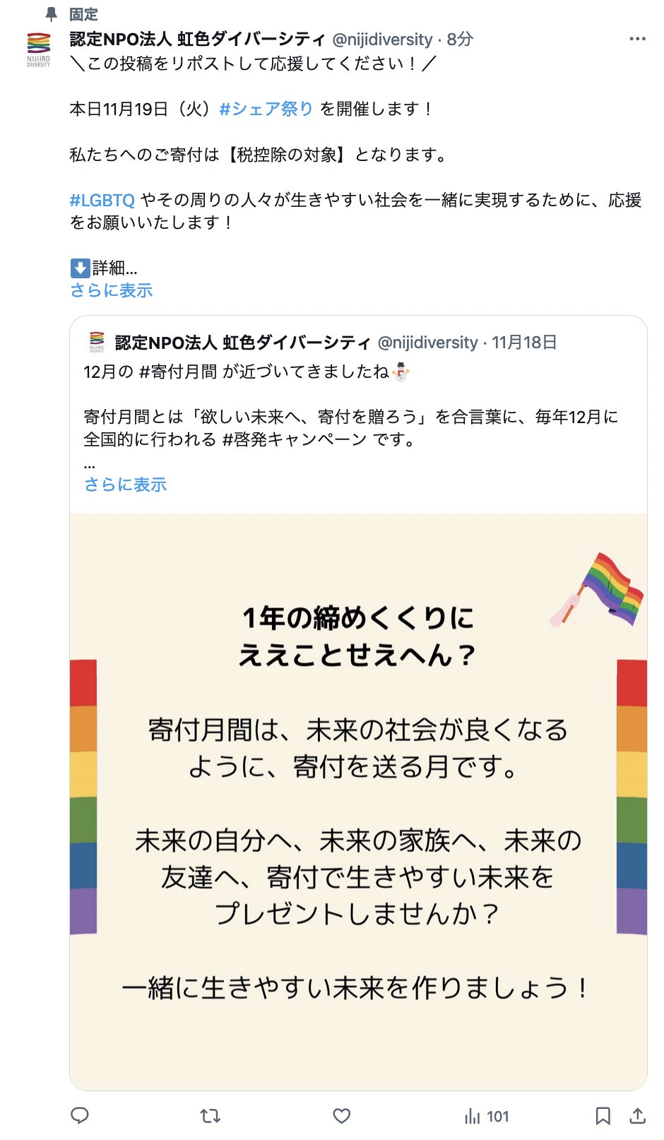本日、11月19日(火)の23:59まで、虹色ダイバーシティのXアカウント( https://x.com/nijidiversity )で【シェア祭り】を開催中です!今年も12月の寄付月間の時期が近づいてきました。寄付月間とは「欲しい未来へ、寄付を贈ろう」を合言葉に、毎年12月に全国的に行われる啓発キャンペーンです。今年は「寄付月間〜1年の締めくくりにええことせえへん?〜」をテーマに、私たちも寄付月間のご寄付を呼びかけていきます。今年はプライドセンター大阪の増床を行ったり、皆様にご支援いただいたこのクラウドファンディングで集めた資金をもとに中高生向け教育プログラムを開始したり、虹色ダイバーシティとプライドセンター大阪にとって新たな挑戦の多い1年でした。来年もこのような活動を継続できるように、そして、LGBTQやその周りの人々が生きやすい社会を一緒に実現するために、寄付月間のご寄付を考えていらっしゃる方は、ぜひ虹色ダイバーシティとプライドセンター大阪の応援を、引き続きお願いいたします。私たちの活動を一人でも多くの方に知っていただくために、Xアカウントをお持ちの方は下記ポストをリポストして応援してください!▼この投稿をリポストしてください!https://x.com/nijidiversity/status/1858661466733506890ちなみに、毎月の継続寄付でこんなことが実現できます。1,000円/月▶︎LGBTQに関する相談を1回実施可能3,000円/月▶︎中高生向けの教育プログラムを1回実施可能5,000円/月▶︎プライドセンター大阪を1日開館可能10,000円/月▶︎どこでもプライドキャラバンを1回実施可能虹色ダイバーシティへのご寄付は税控除の対象となります。下記のURLより、継続寄付や1回の寄付が可能です。▼虹色ダイバーシティへのご寄付はこちらからhttps://nijiirodiversity.my.salesforce-sites.com/また、引き続きSNSでの寄付月間に関する投稿も行っていきますので、ぜひシェアなどでご協力いただけますと幸いです。よろしくお願いいたします!