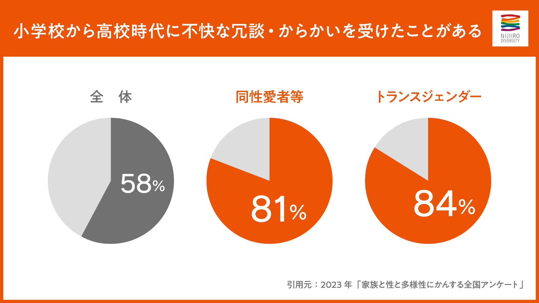 2023年に行われた研究グループの調査(https://www.ipss.go.jp/projects/j/SOGI2/index.asp)では、もし、自分の子どもが同性愛者や性別を変えた人だったら「嫌だ」という回答は47%でした。小学校から高校時代に、不快な冗談・からかいを受けたことがある人は全体では58%ですが、同性愛者等では81%、トランスジェンダーでは84% です。不快な冗談・からかいは、大人になっても多くの当事者が経験しています。