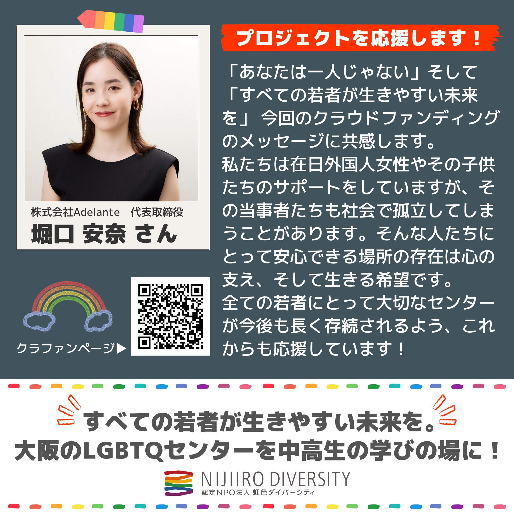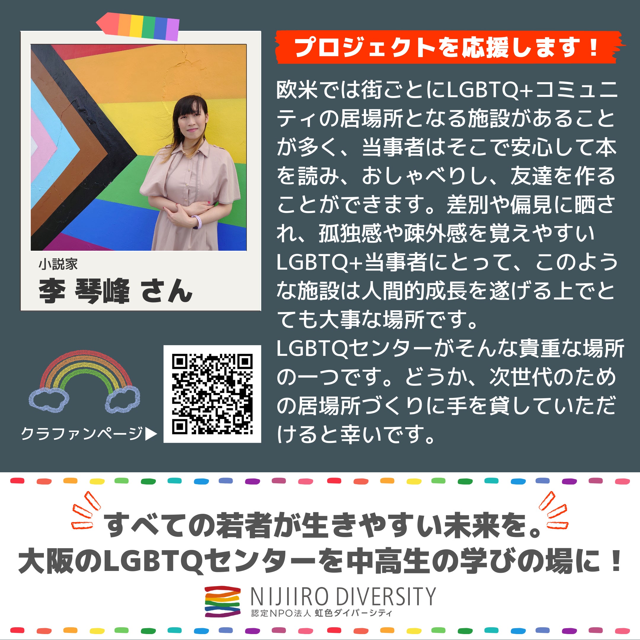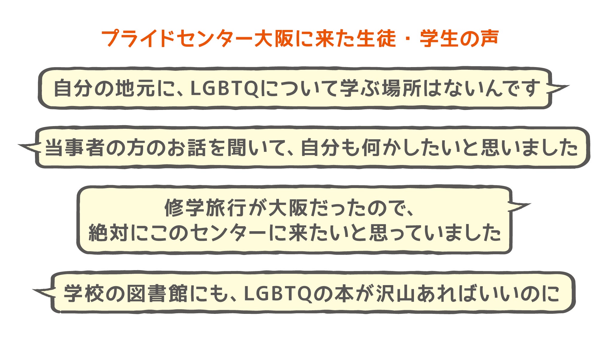 「関西には、京都や奈良があり、元々、修学旅行の行き先として人気です。さらに2025年には、大阪・関西万博があり、2,820万人の来場者を見込んでいます。全国から子どもたちが集まるこの機会に、是非センターに立ち寄って欲しい。センターでLGBTQについて学んだ生徒たちが、家や学校でその話をしてくれたら。生徒たちの力で、地方の雰囲気をもっとLGBTQも生きやすいように変えていけるんじゃないかな、と思います。(長野)」