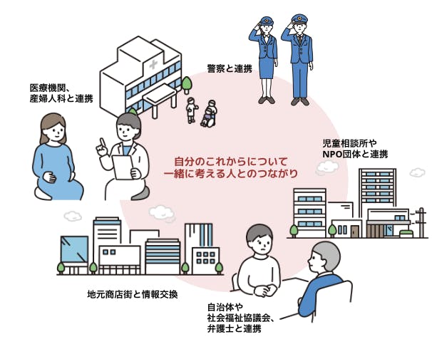 ユースセンターでは、自分のこれからについて一緒に考えてくれる人とつながりをつくるため、医療機関や地元の商店街、自治体などと連携を行なっています。