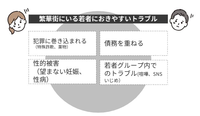 このような繁華街にいる若者は、虐待や経済困難などさまざまな背景があって繁華街に来ており、繁華街は若者にとって居場所になっています。