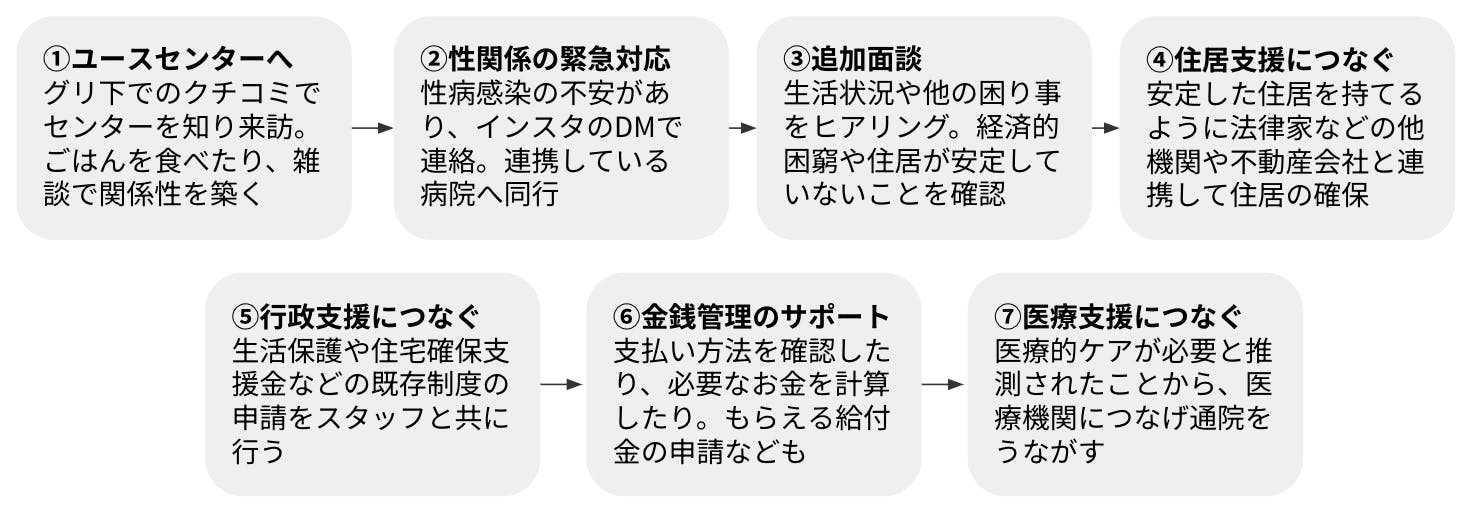 ユースセンターの開所日以外にも個別の相談対応や、役所などへの同行支援を行なっています。InstagramのDMでの相談から病院へ同行したり、安定した住居をもてるように他機関と連携して住居の確保をすることもあります。