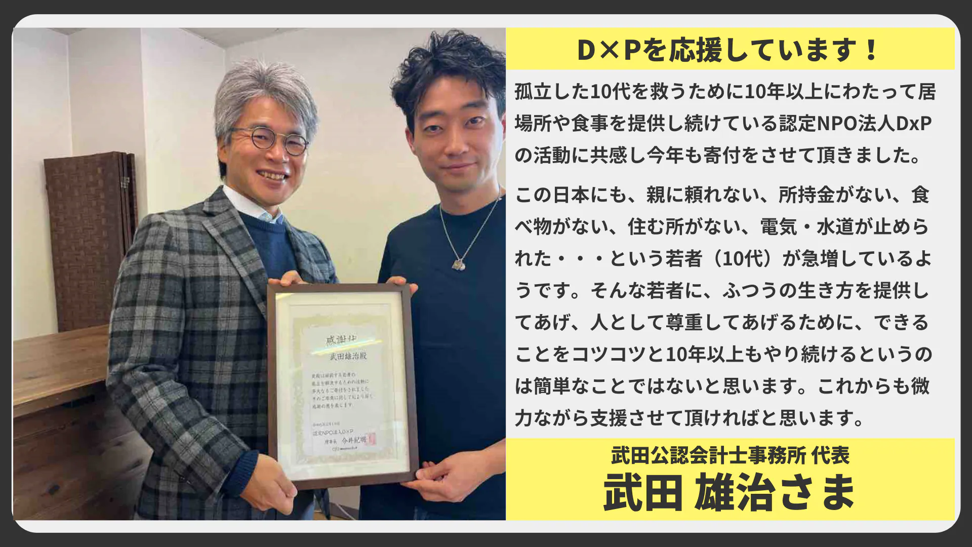 孤立した10代を救うために、10年以上にわたって居場所や食事を提供し続けている認定NPO法人DxPの活動に共感し、今年も寄付をさせて頂きました。