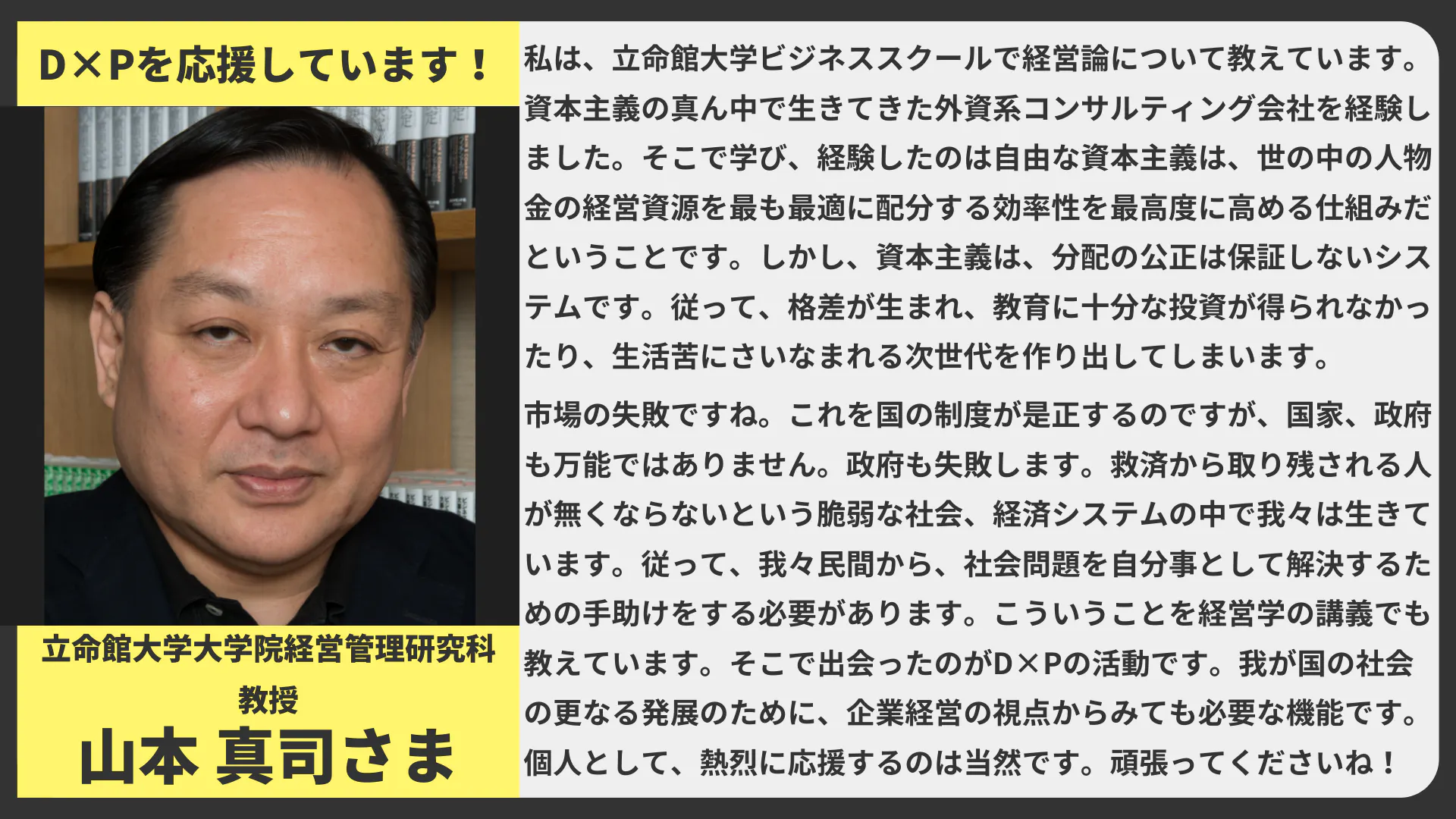 立命館大学大学院経営管理研究科 教授 山本真司さまから応援メッセージが届きました。温かいお言葉ありがとうございます!