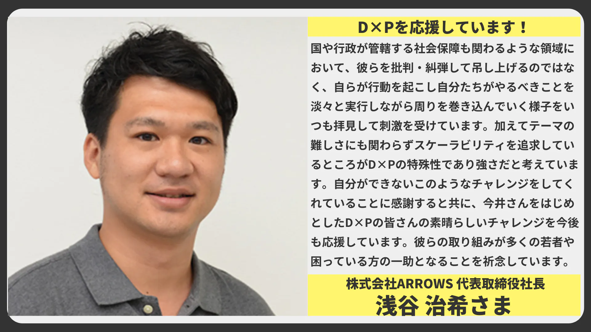 自分ができないこのようなチャレンジをしてくれていることに感謝すると共に、今井さんをはじめとしたD×Pの皆さんの素晴らしいチャレンジを今後も応援しています。