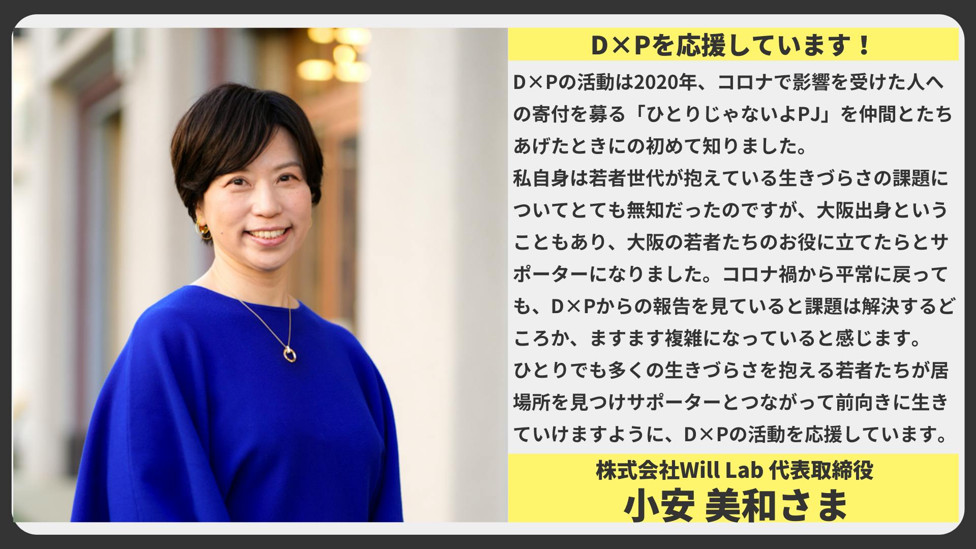 D×Pの活動は2020年、コロナで影響を受けた人への寄付を募る「ひとりじゃないよPJ」を仲間とたちあげたときにの初めて知りました。私自身は若者世代が抱えている生きづらさの課題についてとても無知だったのですが、大阪出身ということもあり、大阪の若者たちのお役に立てたらとサポーターになりました。コロナ禍から平常に戻っても、D×Pからの報告を見ていると課題は解決するどころか、ますます複雑になっていると感じます。ひとりでも多くの生きづらさを抱える若者たちが居場所を見つけ、サポーターとつながって前向きに生きていけますように、D×Pの活動を応援しています。
