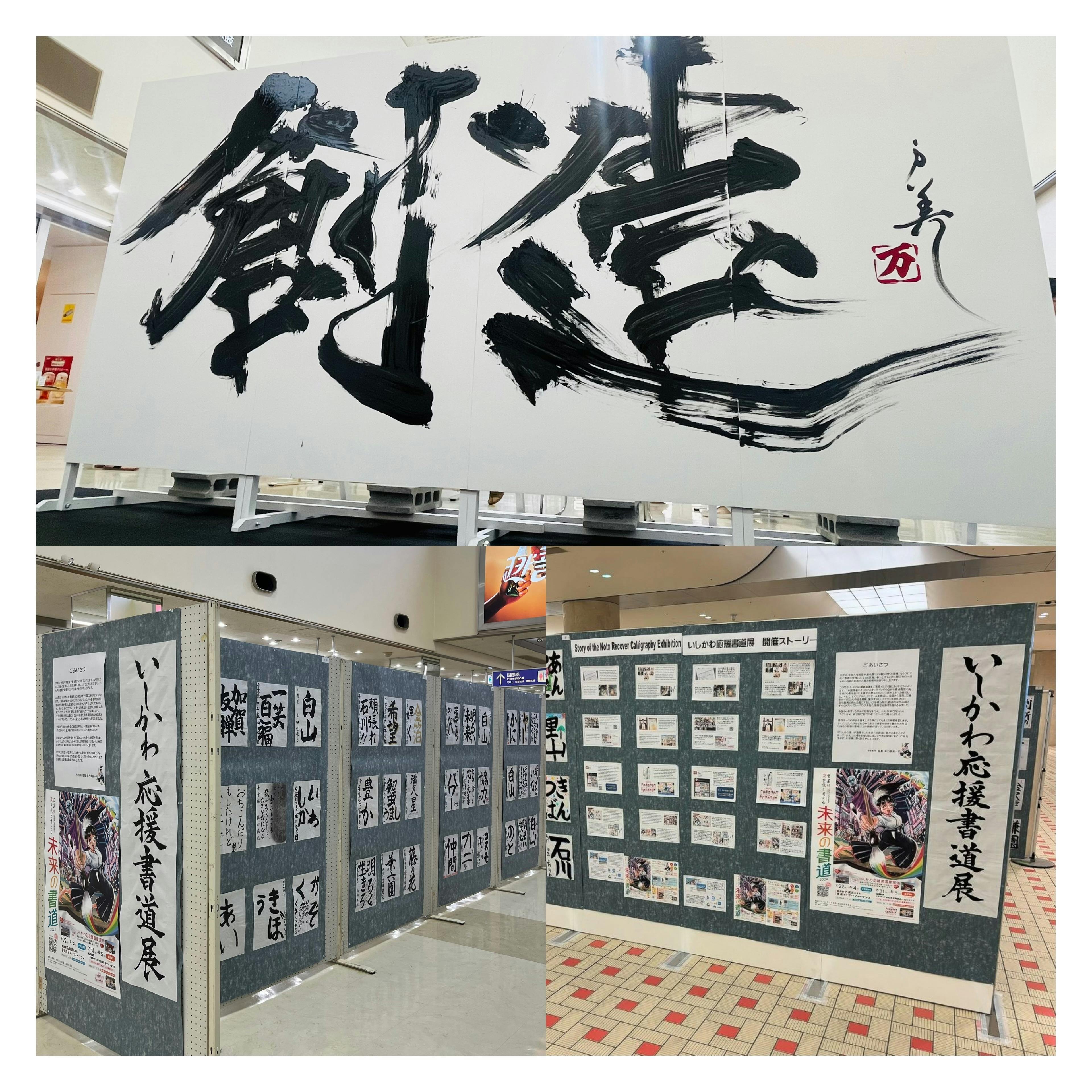 2024/08/01 14:46小松空港、金沢駅の展示が開始しました!!いしかわ応援書道展、2つの会場でご覧になれます!小松空港は8/4まで、金沢駅もてなしドームは8/5までとなっております。出品してくださったみなさんのメッセージ、アイデア、表現、どれも本当に素晴らしいです。ぜひぜひ、ご覧になってください。何度でも見たくなる書道展です!!また、7/28に書道家万美さんの書道パフォーマンスが行われました。会場は小松空港。沢山の方に観に来ていただきました。ありがとうございます!万美さんはまるで踊りを踊っているかのように軽やかに美しく…かつ力強い運筆に、皆心奪われていました!【創造】の字から感じ取れるエネルギーぜひご覧ください。万美さんの作品は、夏休み中小松空港で展示していただいております!!皆さんからのご支援のおかげで、書道展、各イベントも開催できておりますこと、心よりお礼申し上げます。 もっと見る