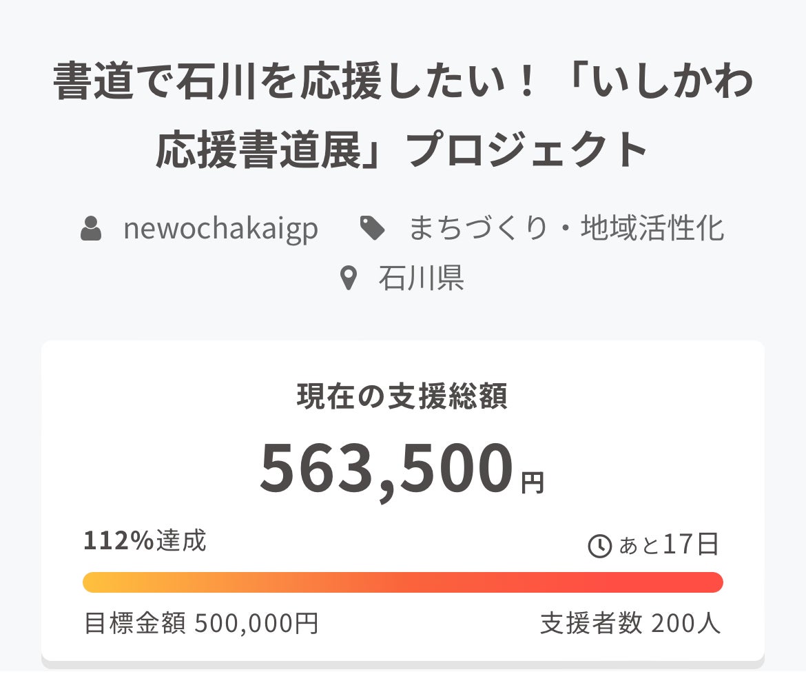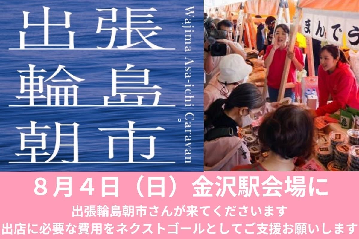 ネクストゴール70万円を目指しますおかげさまで5月12日に、目標金額の50万円を達成することができました!ご支援いただいた皆様には感謝の気持ちでいっぱいです。温かいご支援を賜り誠にありがとうございます。皆様のご支援に感謝しつつ、残り約2週間ネクストゴール70万円を目指します。8/4(日) 金沢駅に輪島朝市を出張出店!書道展にご来場いただいた皆様にも、楽しめる場を設けたいと思っております!また、この朝市で購入することにより、輪島の復興に協力することができます。現地の復旧には時間を要し、現在もお店を開くことができない状況です。今回出張と言う形で書道展の場を提供することで、輪島朝市を応援します!【資金の内訳】・会場レンタル費、作品集製作費 50万円 ▶▷当初目標を達成しました!・輪島朝市招致費用 20万円 ▶▷販売ブースの各種什器や運搬費用等ご支援ください!引き続き、どうぞよろしくお願いいたします。