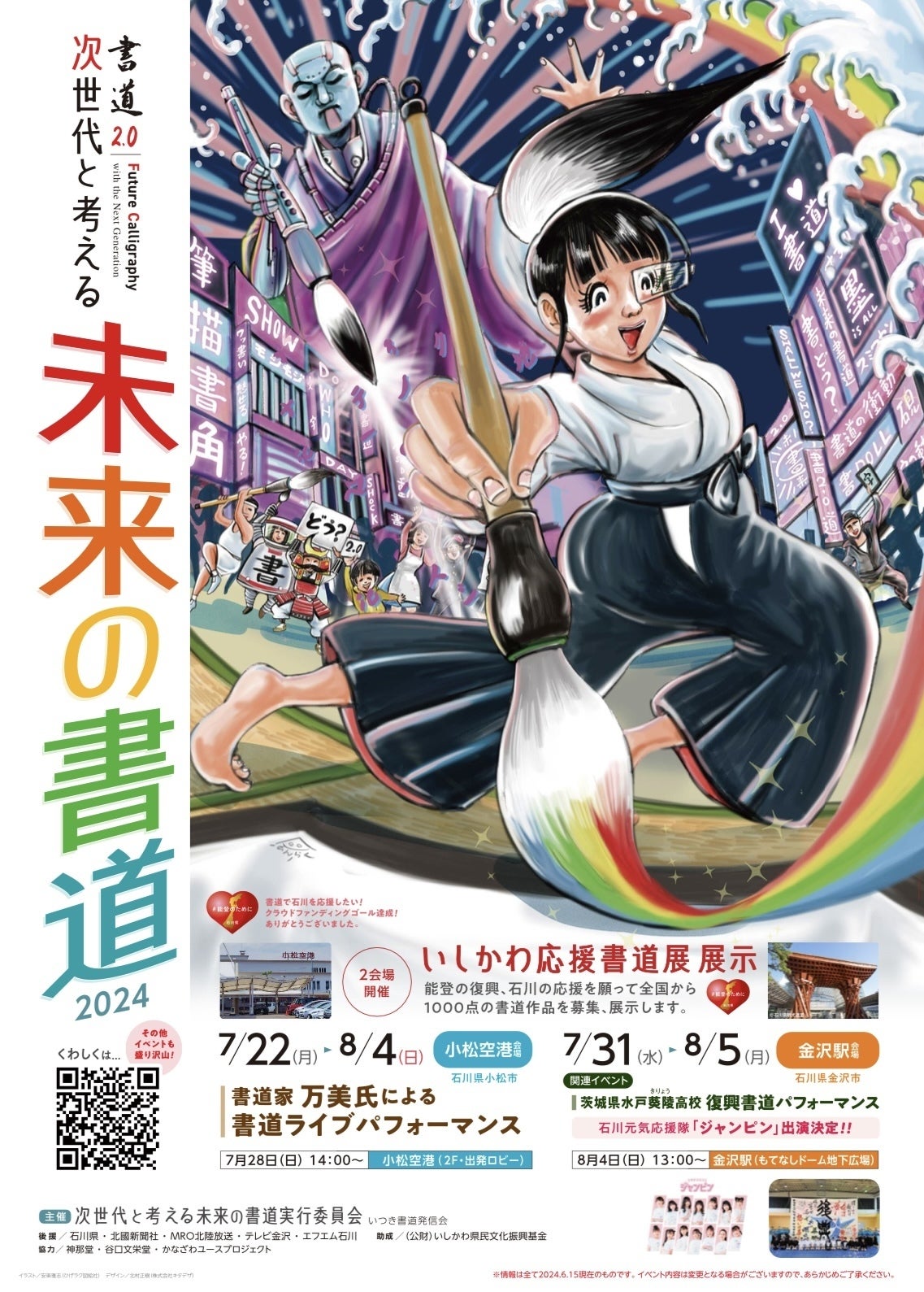 2024/08/01 14:46小松空港、金沢駅の展示が開始しました!!いしかわ応援書道展、2つの会場でご覧になれます!小松空港は8/4まで、金沢駅もてなしドームは8/5までとなっております。出品してくださったみなさんのメッセージ、アイデア、表現、どれも本当に素晴らしいです。ぜひぜひ、ご覧になってください。何度でも見たくなる書道展です!!また、7/28に書道家万美さんの書道パフォーマンスが行われました。会場は小松空港。沢山の方に観に来ていただきました。ありがとうございます!万美さんはまるで踊りを踊っているかのように軽やかに美しく…かつ力強い運筆に、皆心奪われていました!【創造】の字から感じ取れるエネルギーぜひご覧ください。万美さんの作品は、夏休み中小松空港で展示していただいております!!皆さんからのご支援のおかげで、書道展、各イベントも開催できておりますこと、心よりお礼申し上げます。 もっと見る