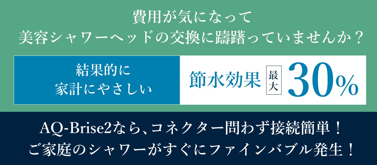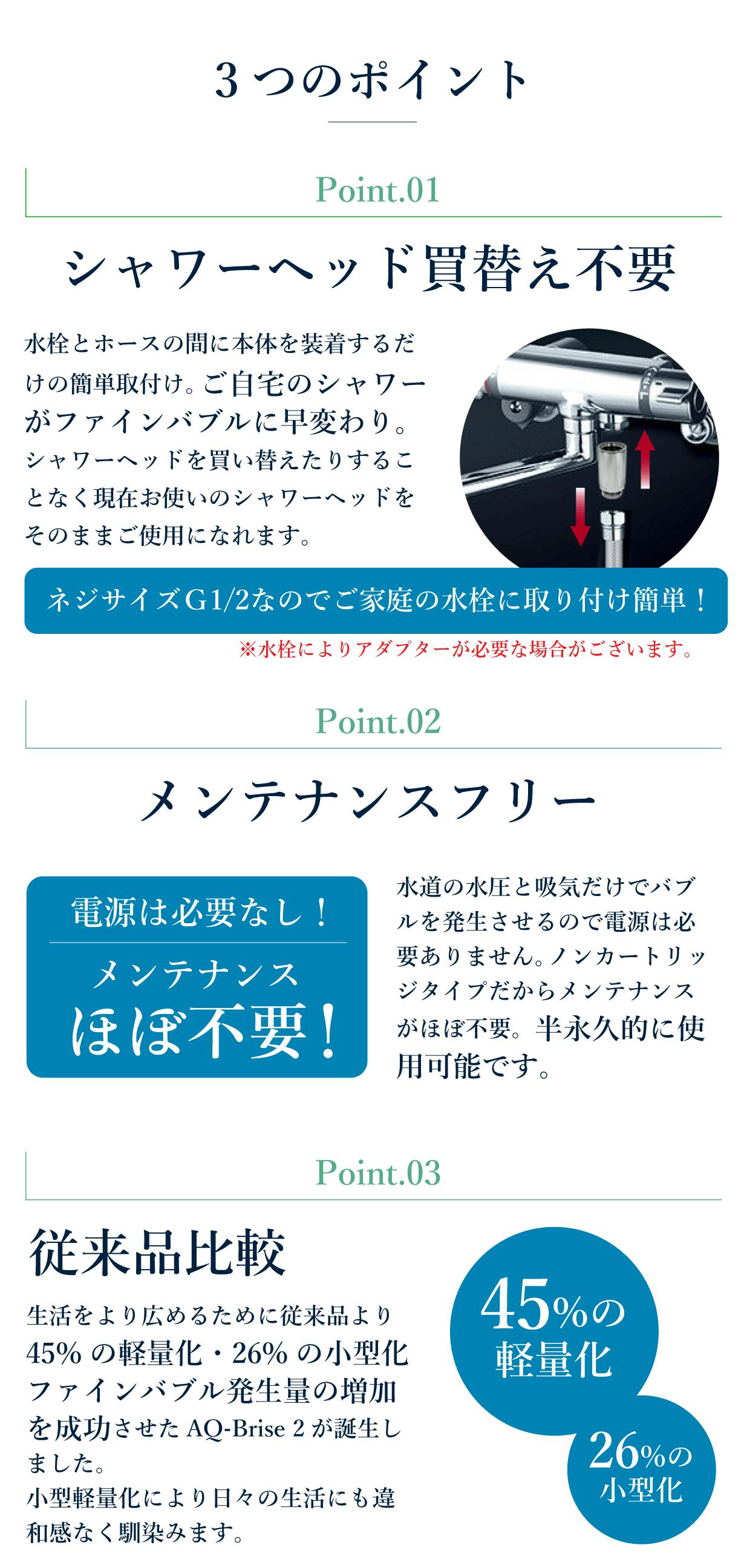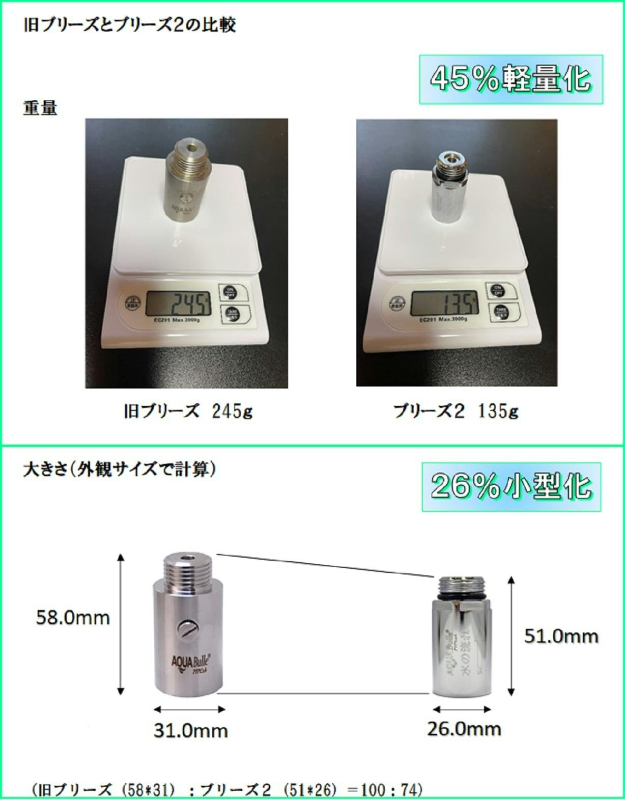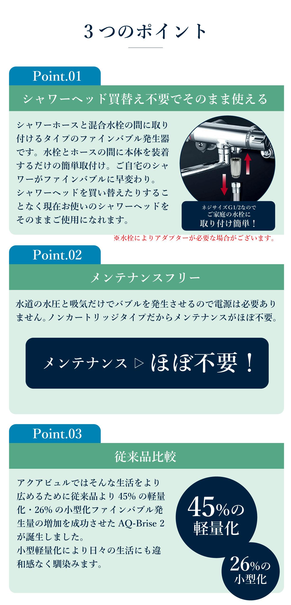 世間に広く認知されるようになってきたファインバブル生活。アクアビュルではそんな生活をより広めるために従来品( (Brise)より45%の軽量化・26%の小型化し、ファインバブル発生量の増加にも成功した『AQ-Brise2』が誕生しました。小型軽量化により日々の生活にも違和感なく馴染みます。