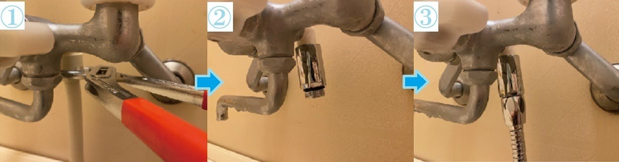 ①水栓からシャワーホースを外します。取り外しにくい場合はプライヤーやモンキーレンチ等の工具をご使用ください。