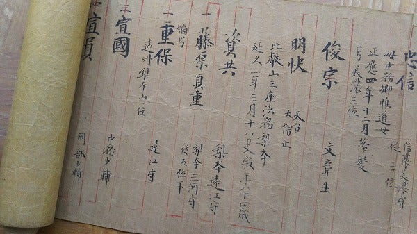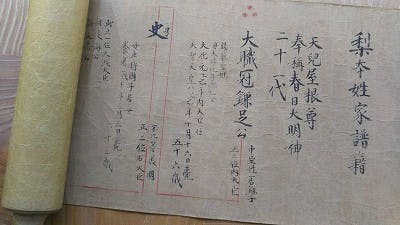 その歴史は古く 秀吉時代の文禄4(1595)年 信濃国高井郡高井村(現:高山村)へ移住し、爾来420年余の歳月が流れました。更に遠く遡れば 歴代当主は平安京や遠江国等に住し、その後 戦国大名よる領国支配が強まった室町中期になって信濃国八丁村(現:須坂市)へ都落ちした記録がみられます。当宿に所蔵されている1400年に亘る歴代当主の記録「梨本姓家譜籍」や古文書類の中には、関わりのあった歴史上の人物として ・第32世 天台座主「梨本(旧:藤原)明快」(平安時代:梨本姓のルーツ)・信濃の領国を侵略した戦国の武将「武田晴信(信玄)」・徳川幕府二代将軍「秀忠」のとき 安芸広島城の石垣無断修理を咎められて、当地(高井村)へ減封・移封され 不遇の晩年を過した戦国大名「福島正則」・江戸時代の俳人「小林一茶」と その門人「梨本稲長」との交遊など 様々な関連史料が残されています。