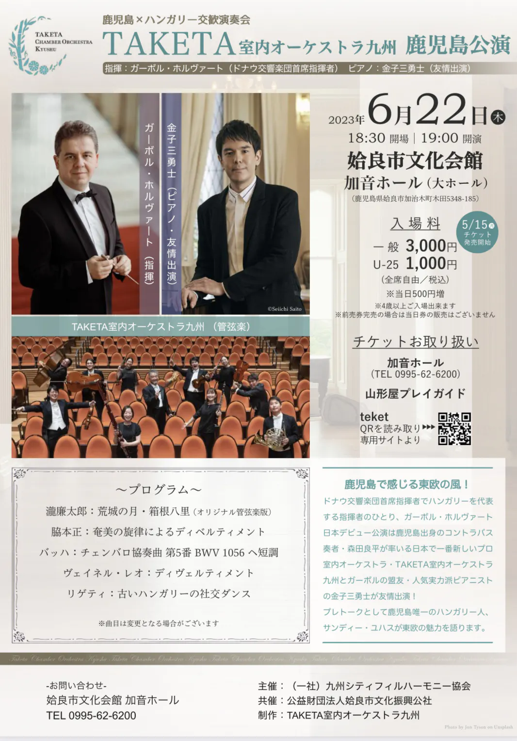 2024/05/01 10:18いよいよ公演まで1ヶ月!ハンガリー・ドナウ交響楽団よりオフィシャルフライヤーが到着しました。ソリスト・金子三勇士さんのかっこいい写真、そして、、、RENTARO Takiの文字が!!!いよいよ、廉太郎の音楽を届けるんだ、、、と気合いが入ります。ハンガリー・ブルガリアでは作曲家の河野敦朗さんによる廉太郎の「四季」の管弦楽版を初演いたします。こちらもお楽しみに! もっと見る