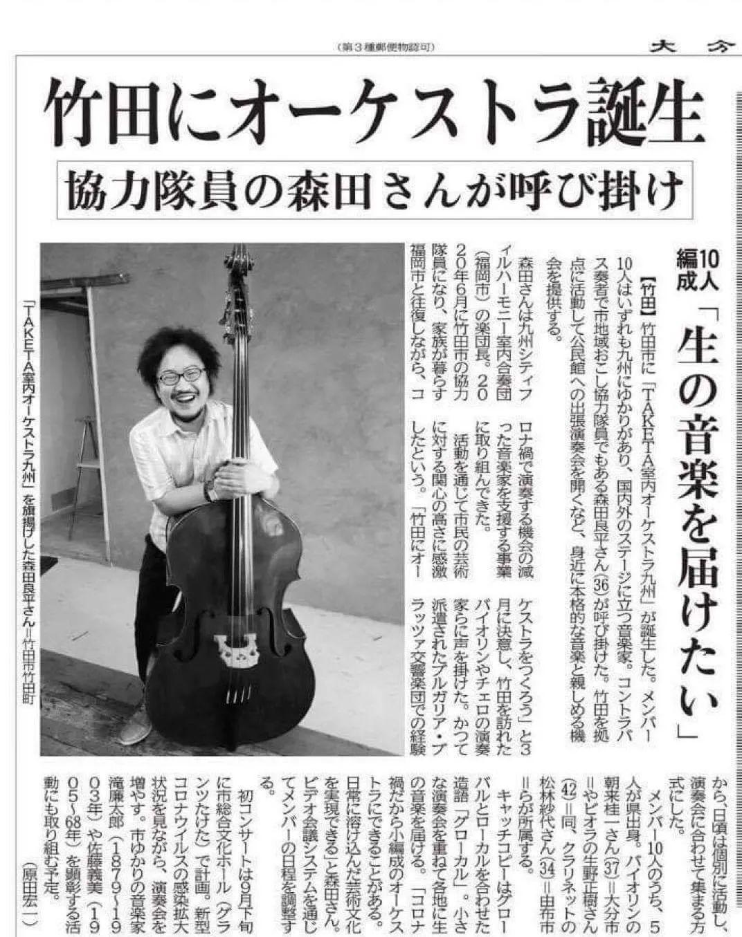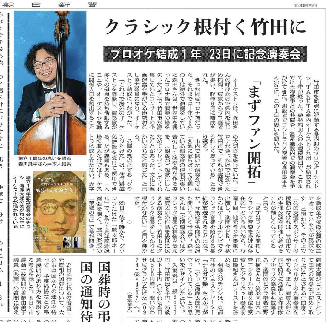 RENTARO室内オーケストラ九州コントラバス奏者・プロデューサーの森田良平です。
