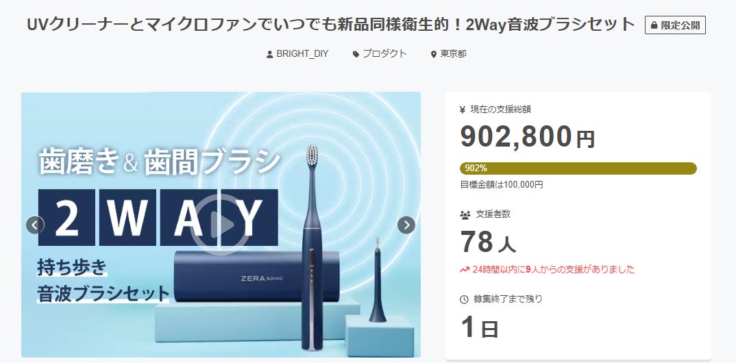 この度は「UVクリーナーとマイクロファンでいつでも新品同様衛生的!2Way音波ブラシセット」に支援頂き誠にありがとうございます!