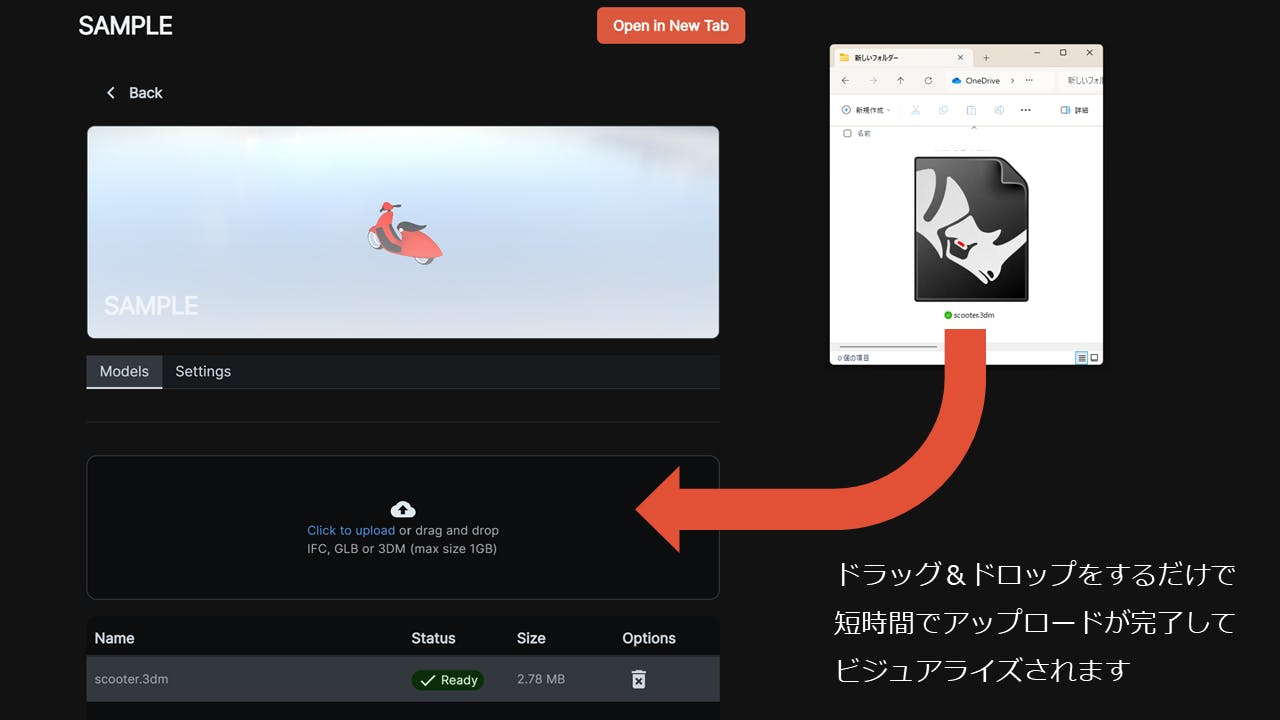3Dモデルのアップロードから視覚化まで要する時間はわずか数秒間。専用ソフトでデザインされた3Dモデルが瞬時にアップロードされます。複雑かつ精密な3Dモデルを軽量なキャンバスへレンダリングするため、大規模で複雑な3Dデザインを遅延や中断なくホスト可能です。