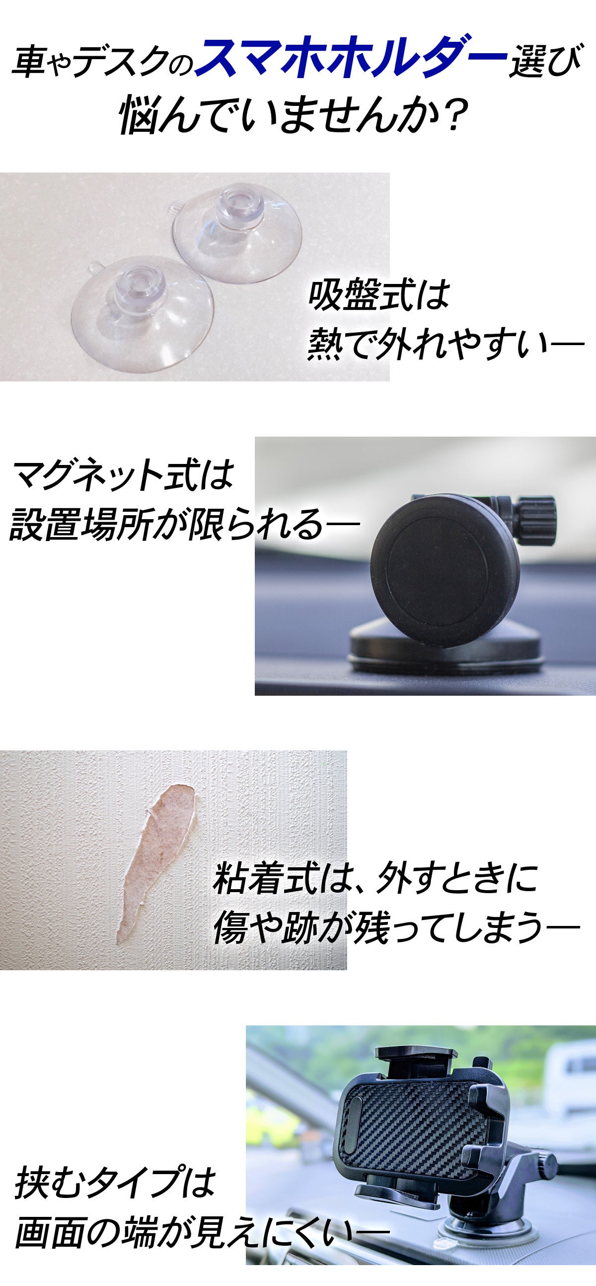日頃から車で移動するときにスマホのナビを活用していたため、車内で使用できるスマホホルダーが必要でした。しかし、吸盤式や粘着式のホルダーでは、車内の温度に耐えられず設置場所に傷や跡がついてしまう…。