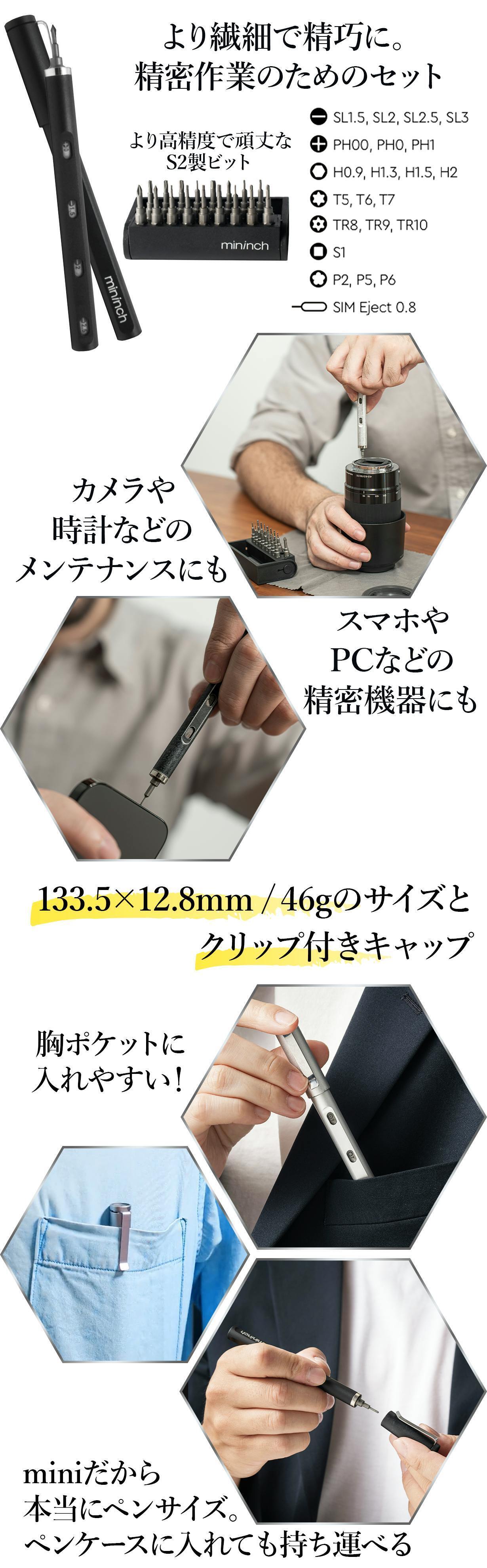 ToolPen miniは、精密機械用のより精巧なビットを搭載しており、さまざまな作業に対応可能です。大型機材の組み立てや家具のメンテナンスにも安心して使える頼りになるツールとなっています。精密さと機能性を兼ね備えたビットは、ユーザーにとって夢のような作業体験を提供してくれることでしょう。
