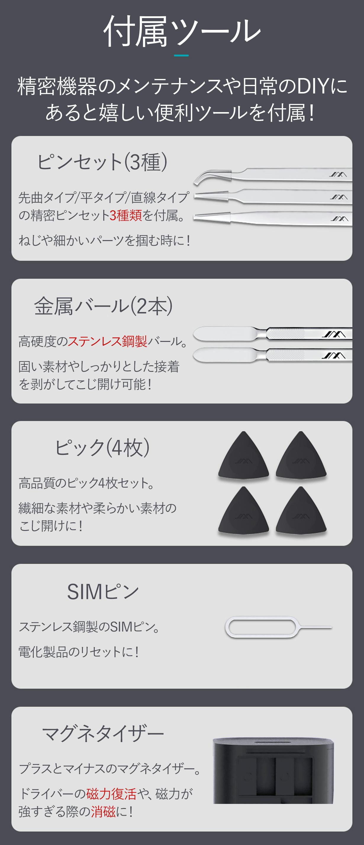 DIYやメンテナンスに便利な精密作業用の各種ツールを付属。