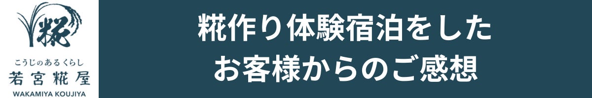実際に、糀作り体験をなさったお客様からご感想を頂きました。「普段食べているお味噌や糀はなじみがなかったが、そういうものがどういう風に作られているのか、どういう苦労があるのか知ることができることが魅力的」「糀作りの中で、食の大切さはもちろん、仕事への向き合い方など色々なことを考えられるし、人との出会いも最高」とご感想を頂いております。下記のお客様インタビューをぜひご覧ください。