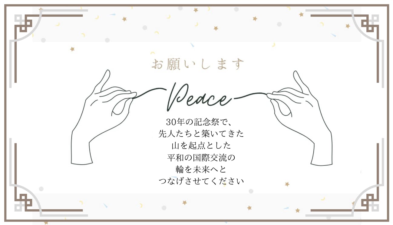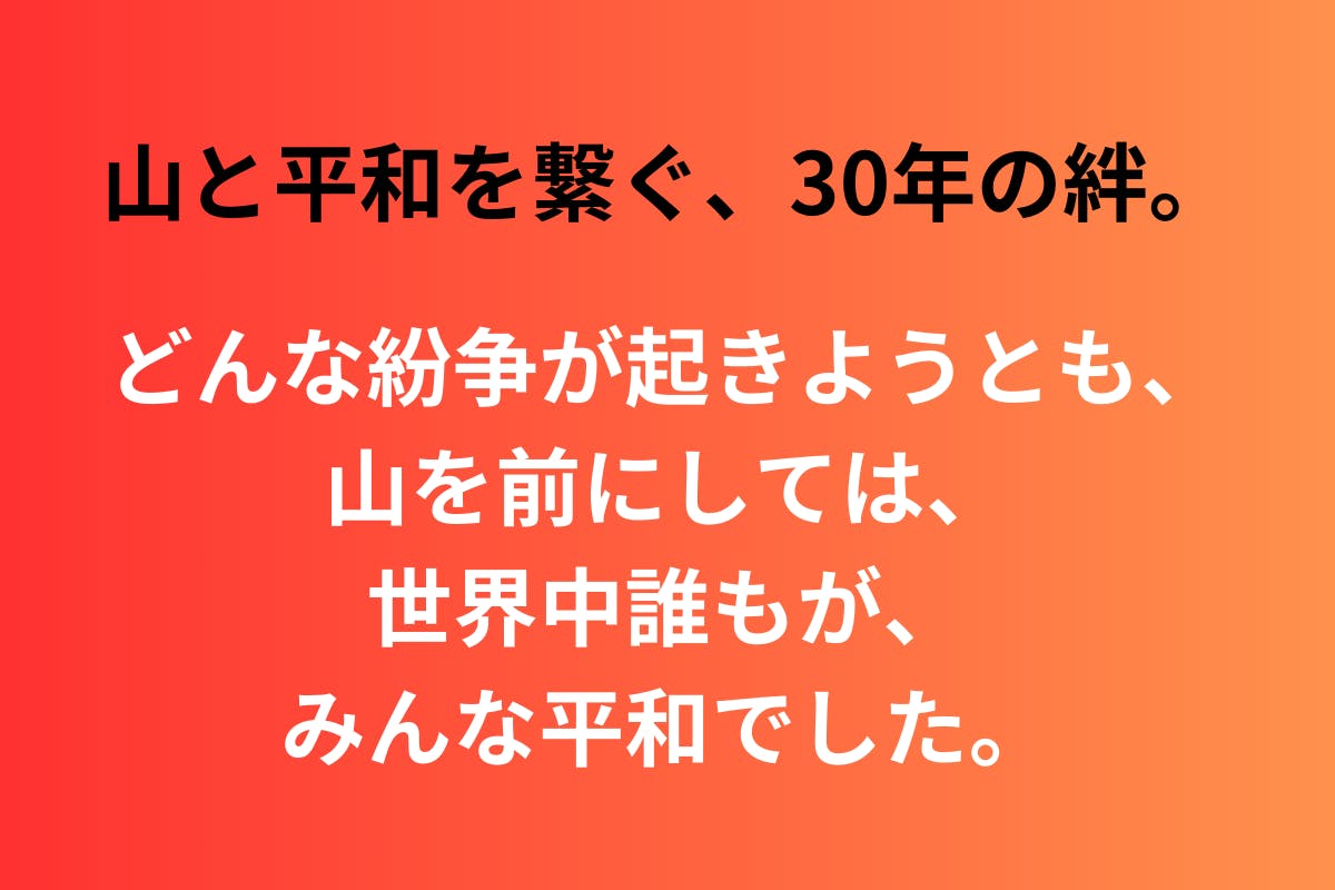 この度、アジア山岳連盟創立30周年を記念いたしまして、世界から山仲間を集い、平和を祈る山の行事、世界山岳平和祭を開催することになりました。