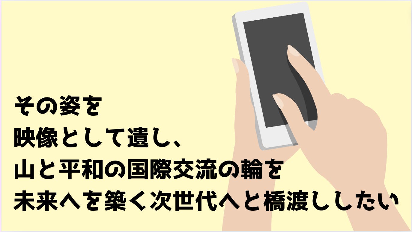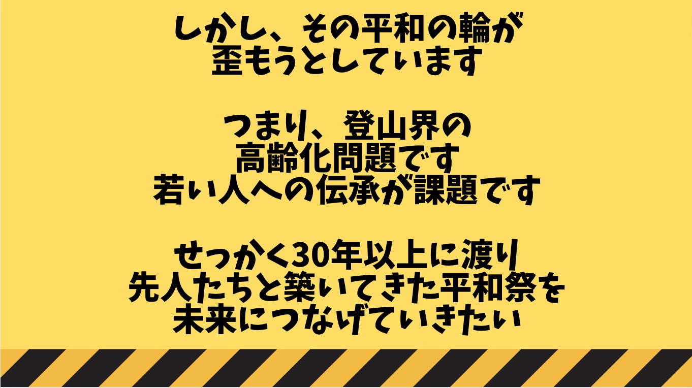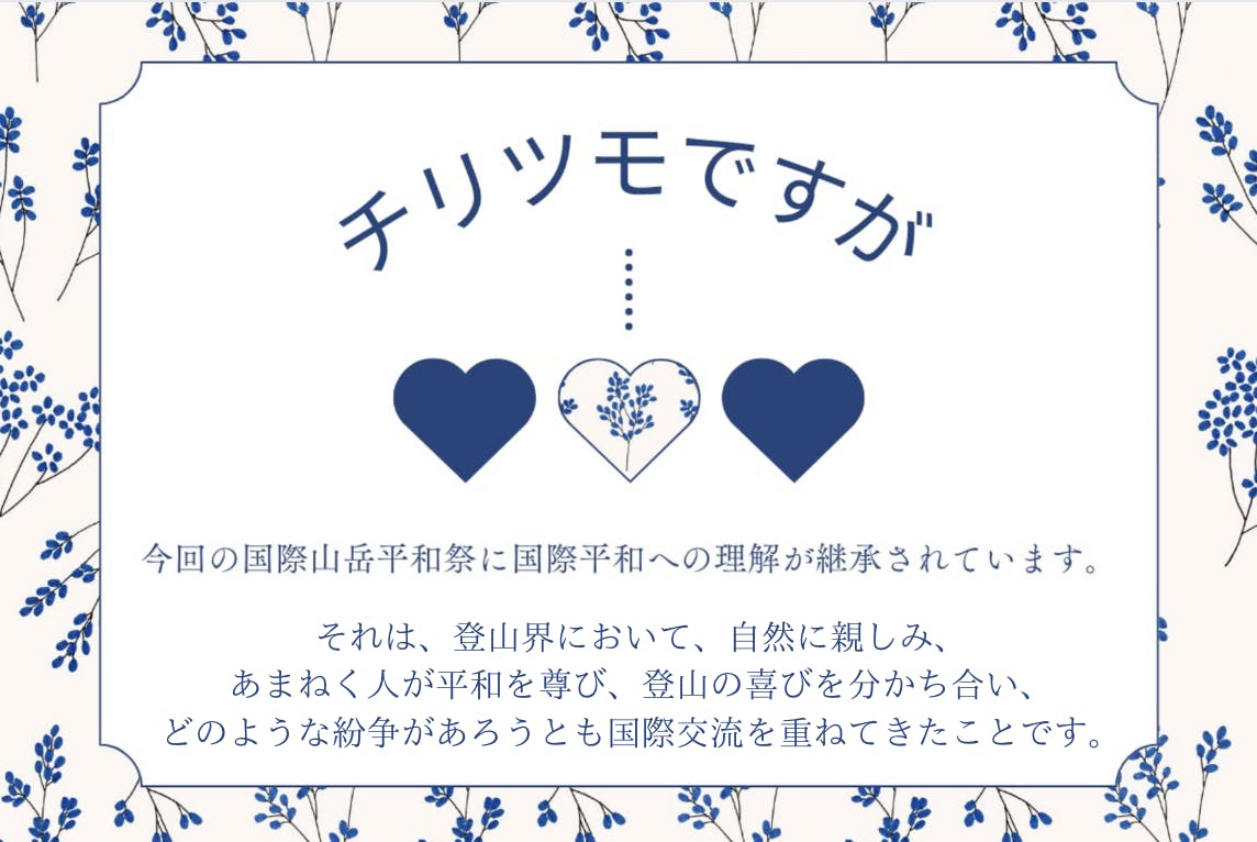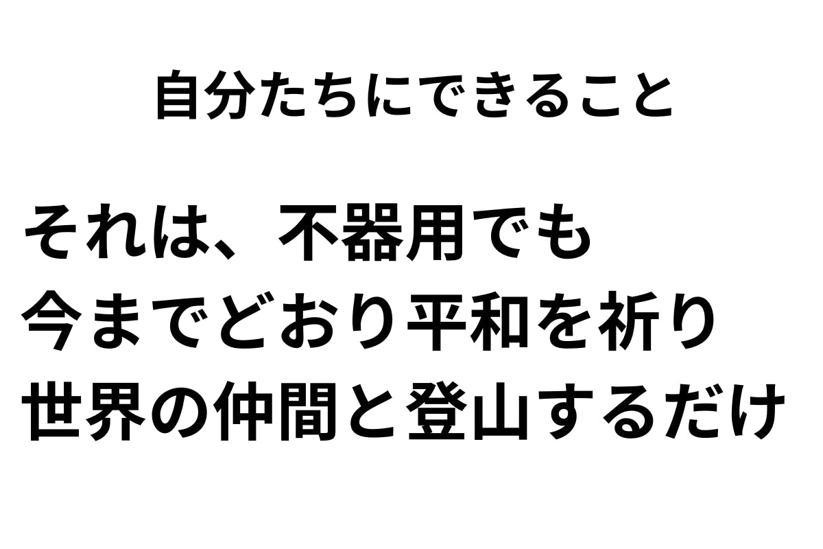 なかなか世界中が平和になることは難しく、世界的に親しまれている山の活動で国を超えての交流を深め、平和を祈願し、これからの世代にも継承していきたいと思います。デジタル世界から遠いシニア世代ができることをデジタル世代が違う形でひきつぎ、今後も山と平和のメッセージを受け継いでもらいたいです。