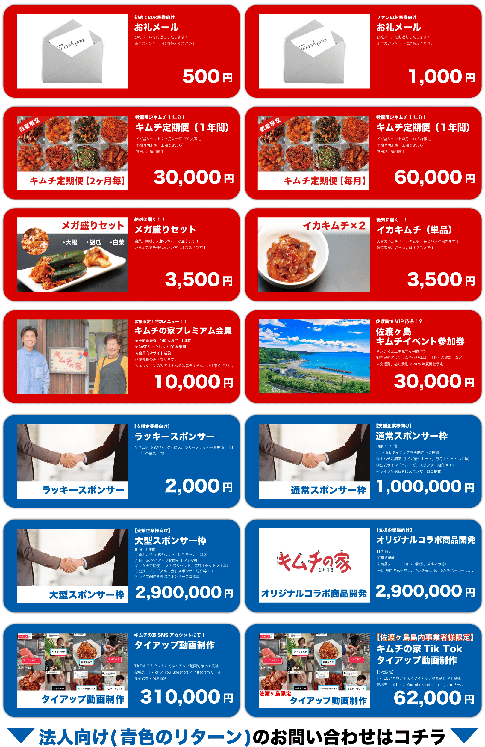 プロジェクトにご支援いただいた方には、感謝の気持ちを込めて、ここだけの限定キムチセットや、キムチ作り体験、佐渡ヶ島へのご招待など、魅力的なリターンをご用意しております。