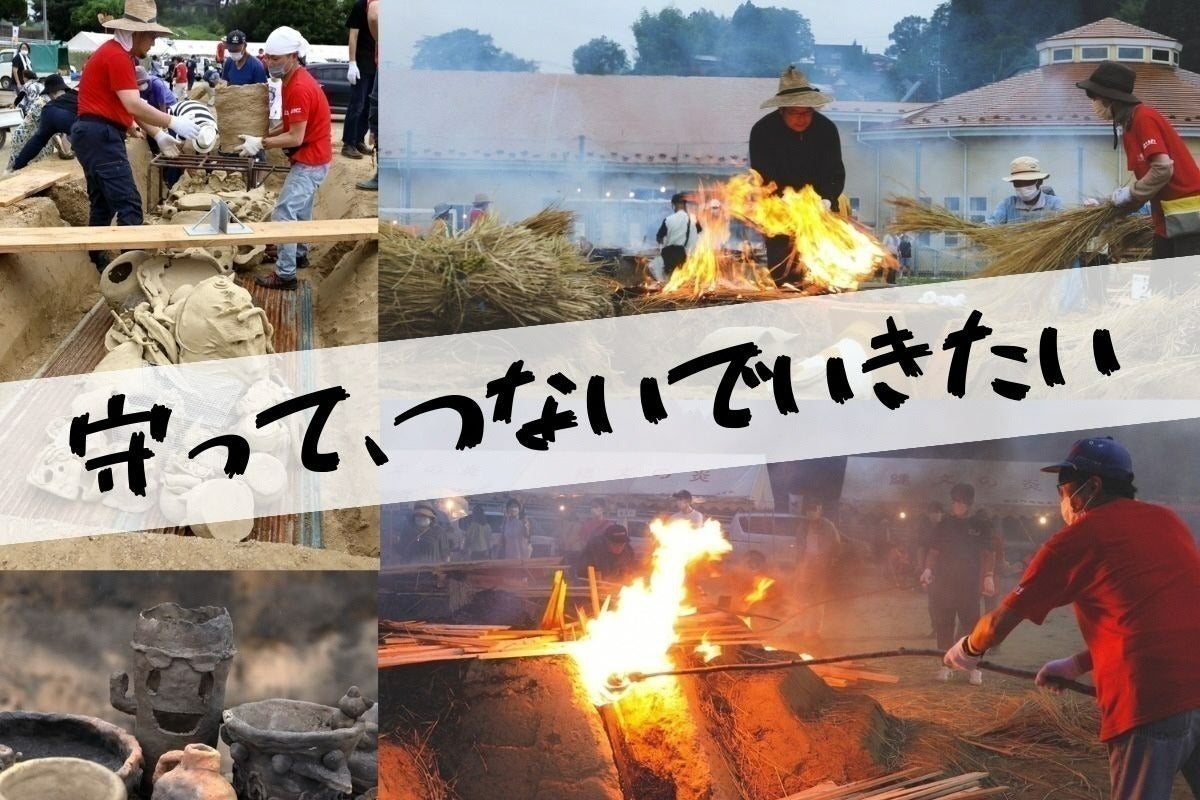 1976(昭和51)年、考古学者の塩野半十郎氏(故人)が古代縄文式野焼きを復元した祭りを提唱し、藤沢焼窯元らが中心となって第1回が開催されました。祭りが始まった当時の藤沢町は急激に過疎化が進んでいて、「祭りを地域活性化のバネにしよう」と住民と行政が手を携え、新しいまちづくりに挑みました。今から48年前に灯されたその「古里再生の炎」が今なお燃やし続けられています。