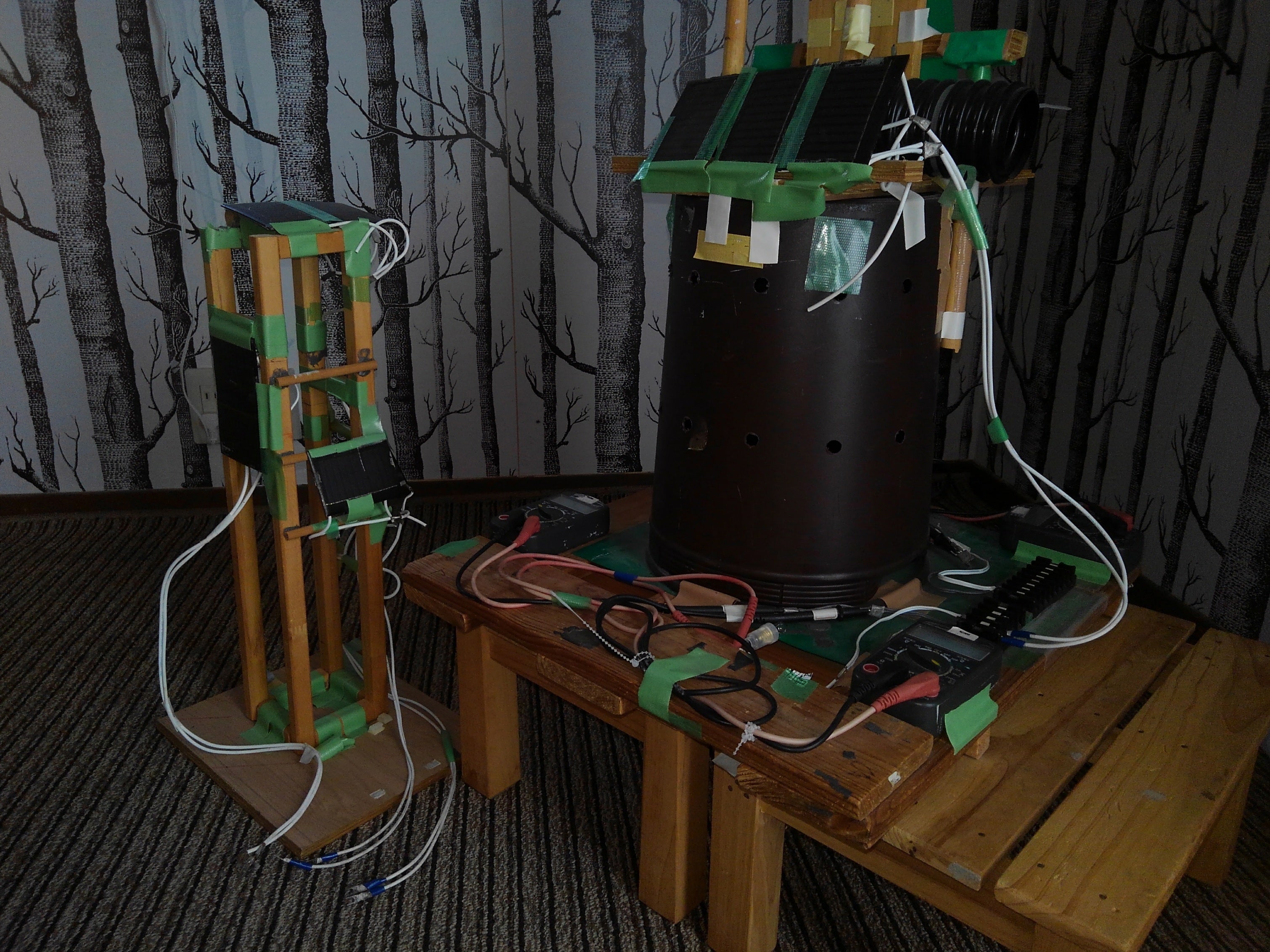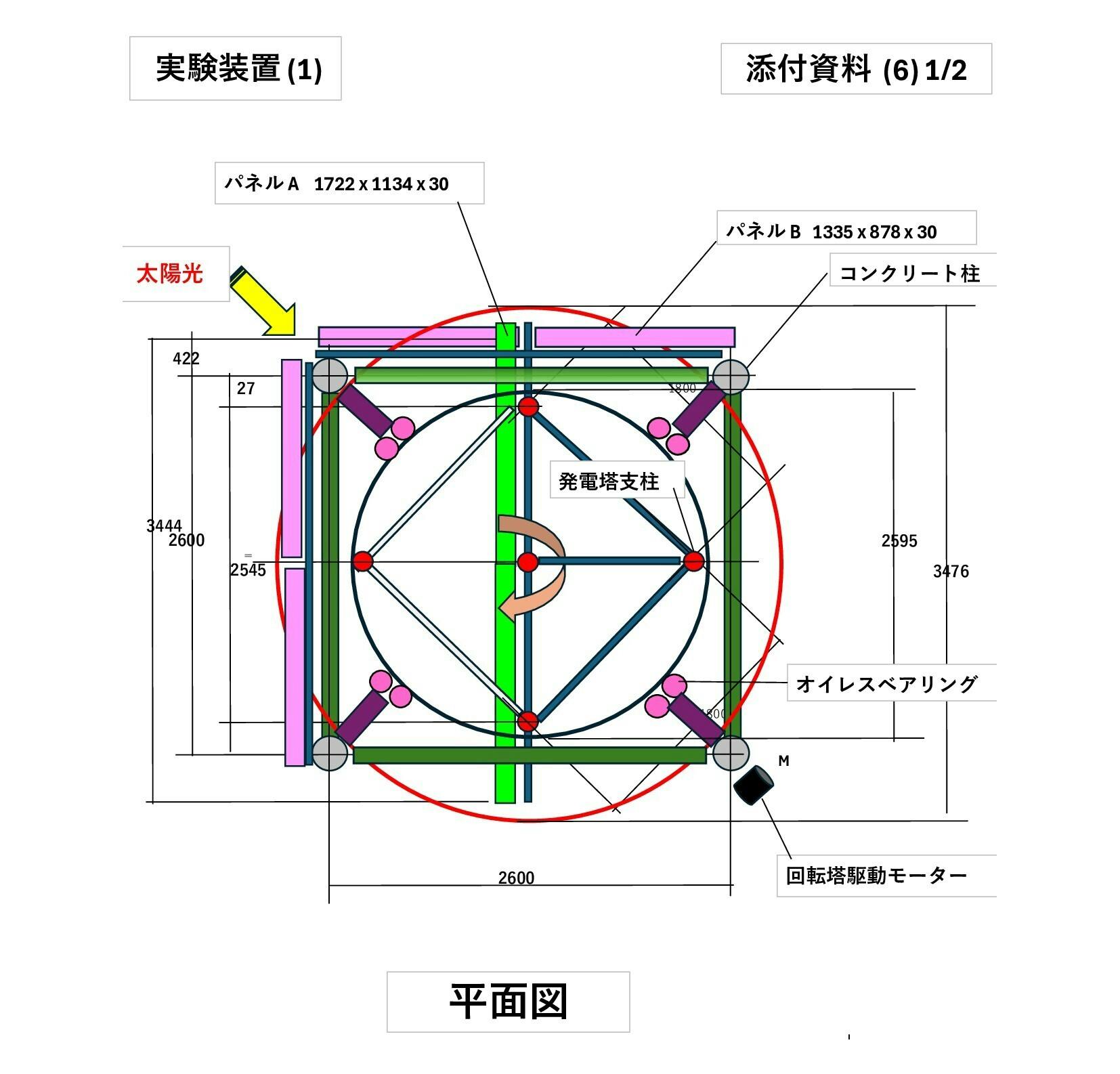 - - 実験装置(1) の太陽光パネルは30°の傾斜(対垂直面)をつけ回転塔に固定