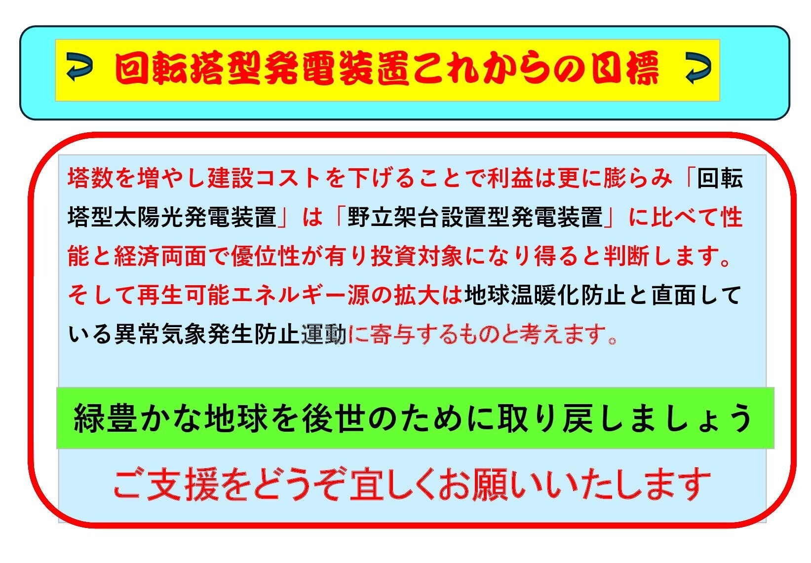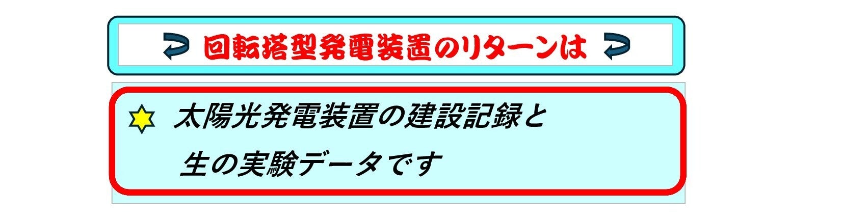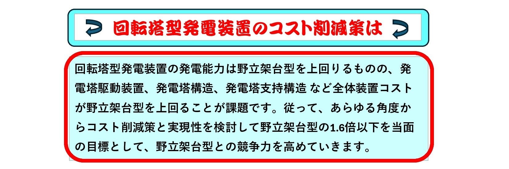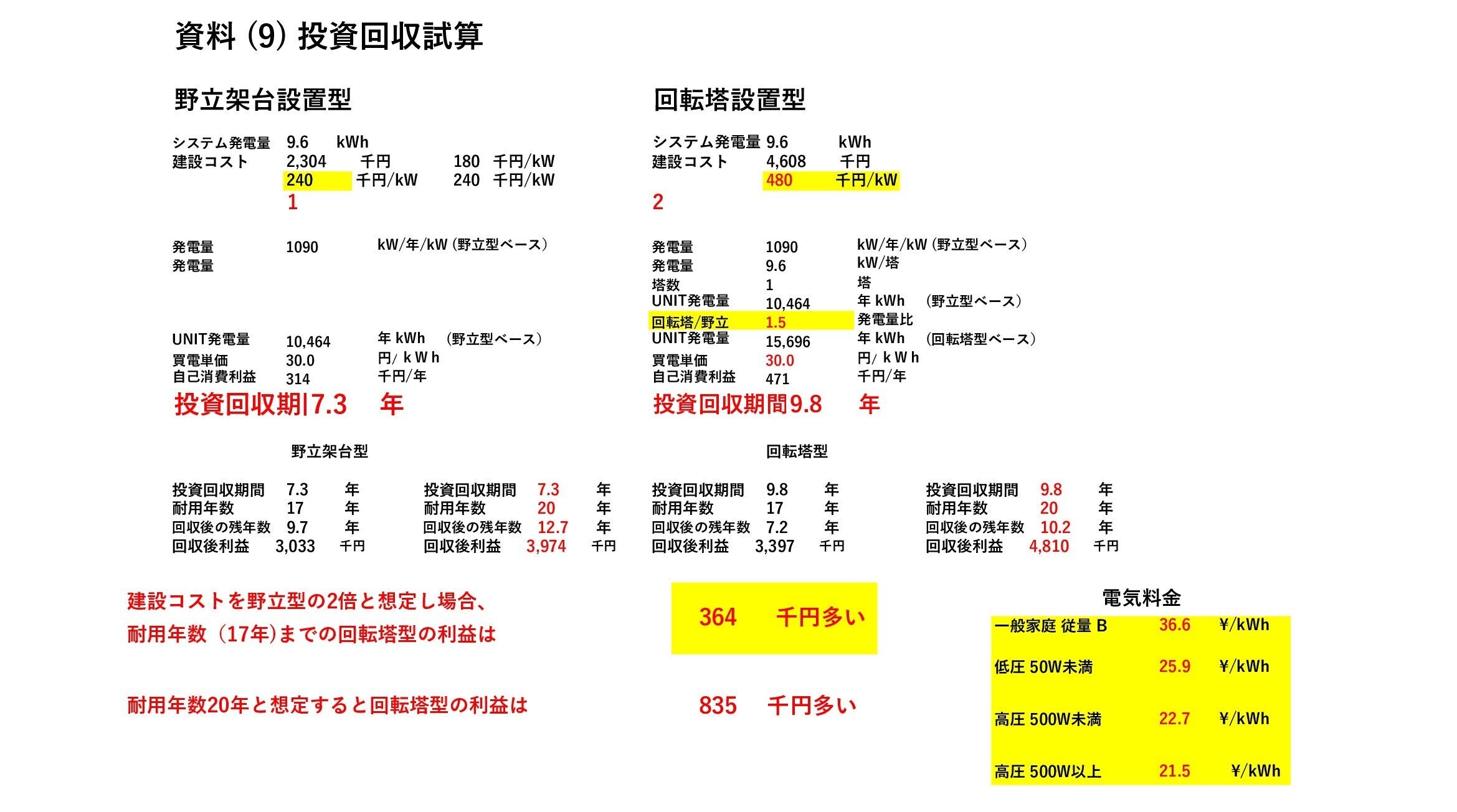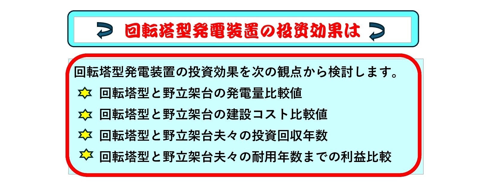実用化に際しては塔高を高くし1塔当たりの発電量を増やしてkW当たり単価を安くする必要があります。kW当たりの単価を安くすることと、「回転塔型」の大きなメリットである「野立架台設置型」より発電量が多いことをベースに投資回収の試算をすると、「回転塔型」の初期投資金額が多くても装置の耐用年数である17年以降は「回転塔型」の利益が「野立架台型」を上回ります。投資回収計算例を添付資料-9に詳述します。計算の比較条件として