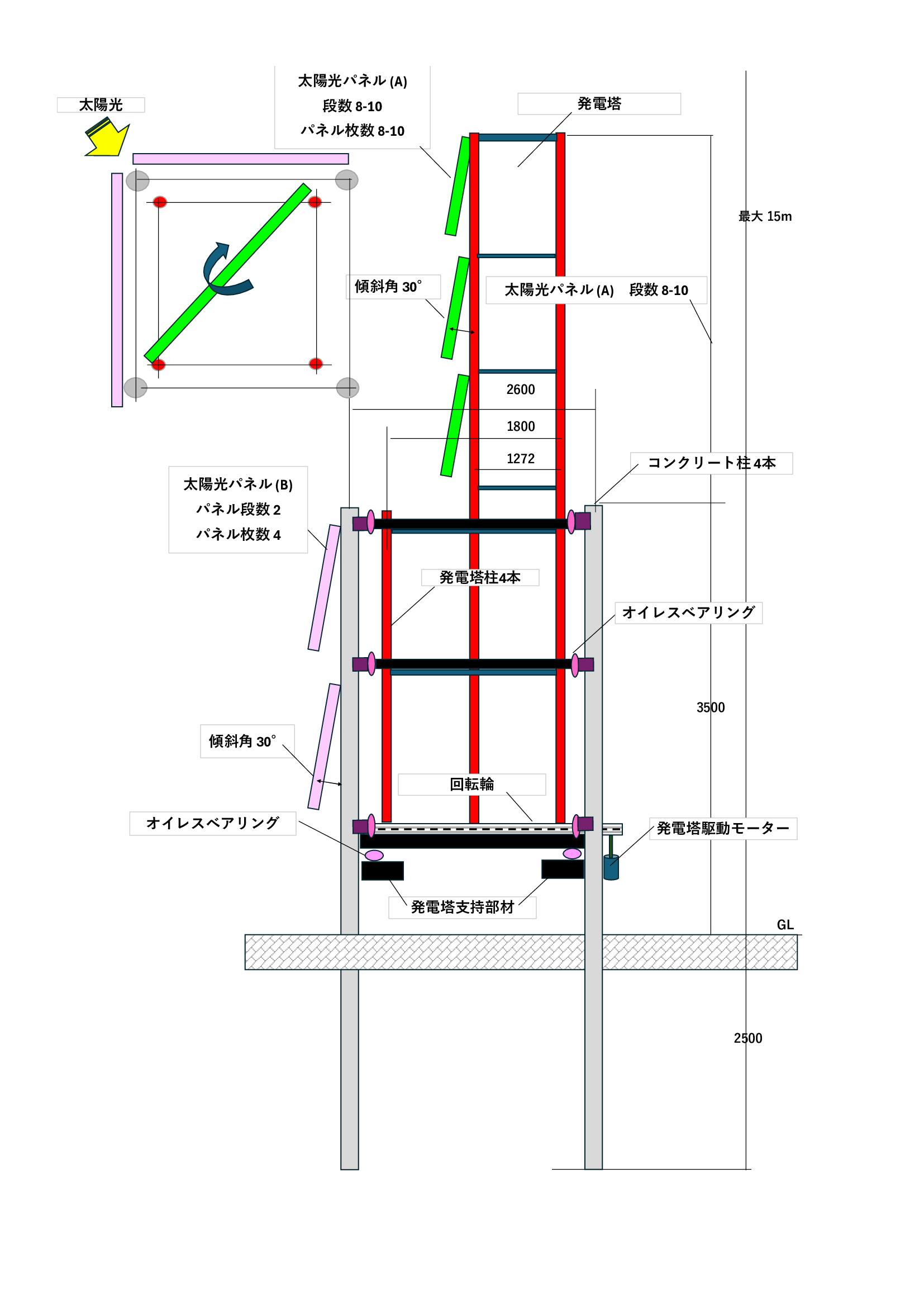 発電塔は軽量で強度のある部材で構築し、地震・強風に備えるため地中深く埋め込んだ4本のコンクリート柱で支持します。発電塔の自重と横風による揺れはコンクリート柱に固定されたオイレスベアリングで支えて回転に要する動力を小さくしています。装置の概略仕様は以下を想定しています。