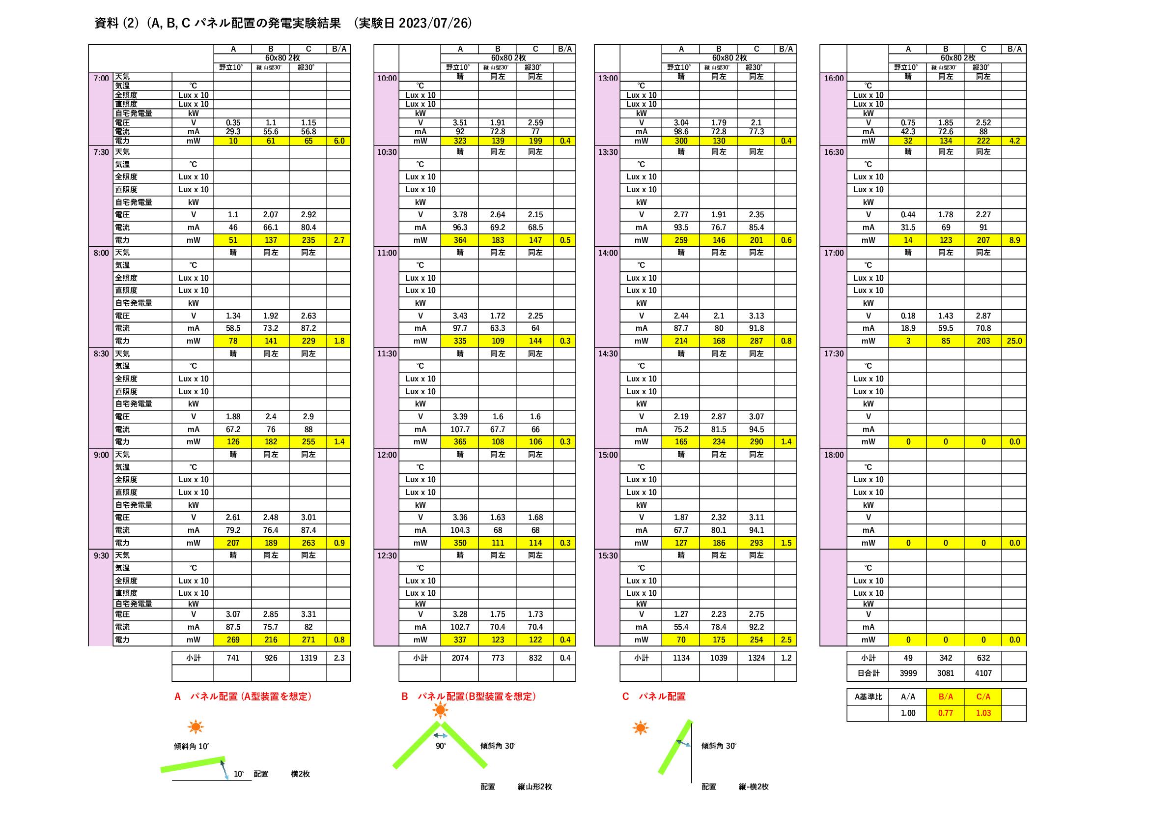 (A,B,C パネル配置の発電実験結果 (実験2023/07/26)