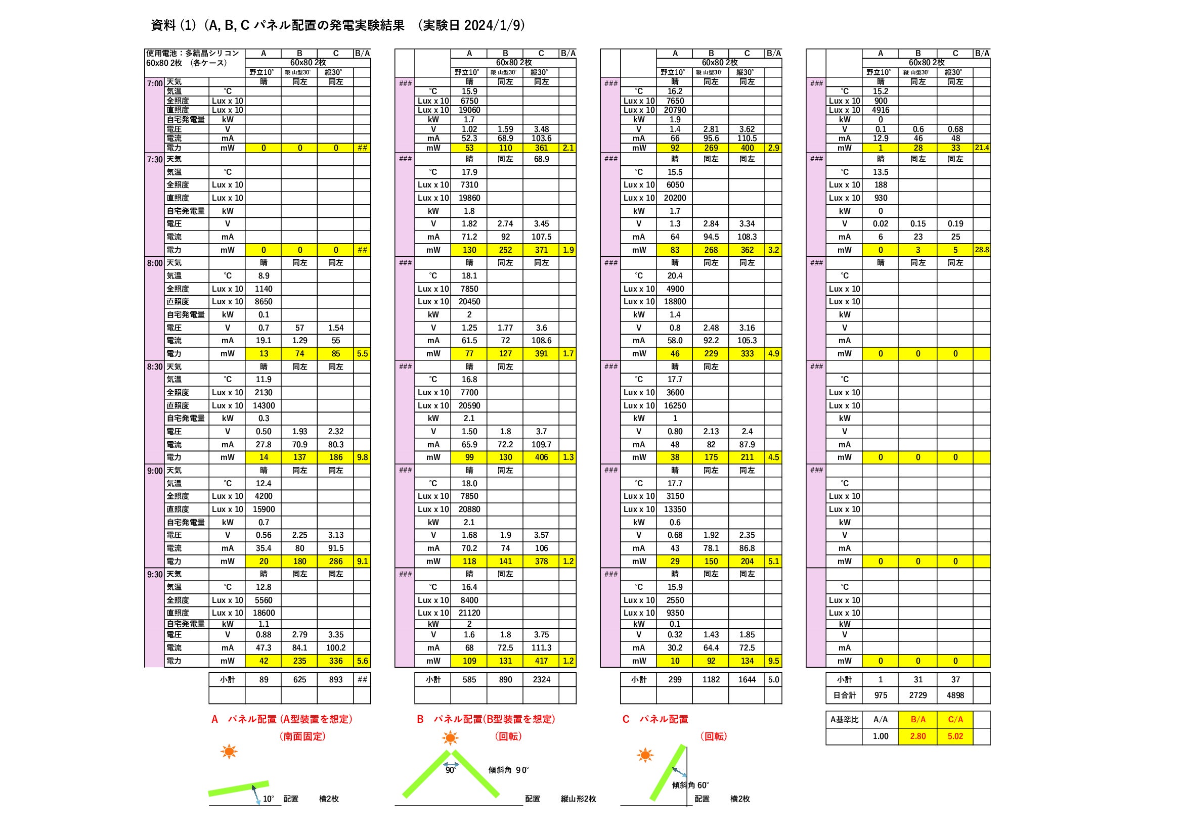 (A,B,C パネル配置の発電実験結果 (実験日2024/01/9)