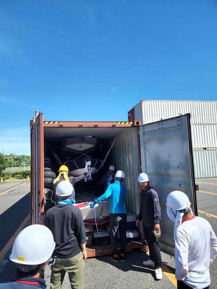 7月末に、購入した艇をアルゼンチンに送るための準備を行い、コンテナに積み込みました。日本チーム全体で7艇をひとつのコンテナに入れ、3ヶ月弱かけてアルゼンチンに到着する予定です。 作業自体は猛暑の中での重労働でしたが、ベテランセーラーの方々に助けられ、無事に完了しました。輸送中、コンテナ内の温度は60℃を超えることもあるため、接着剤やスプレー缶などは載せられませんでしたが、全て順調に進みました。あとは現地で船と再会するのが楽しみです!