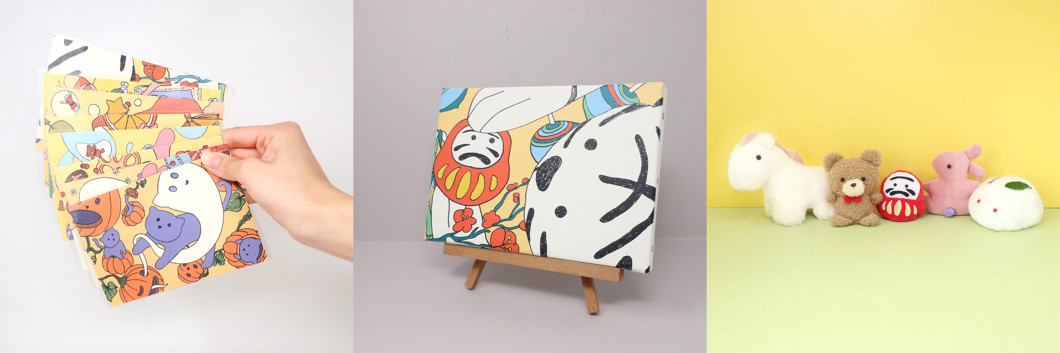 こんな人の心の迷いや、愛への渇望を描いたイラストを8枚とそこに登場するキャラクター達の手作りぬいぐるみを5匹用意しました。