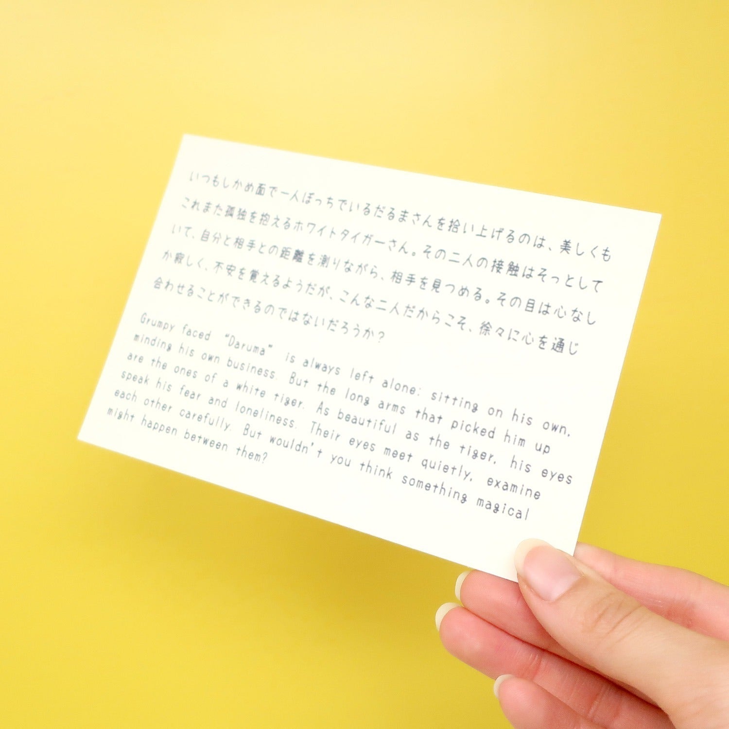 Grumpy faced “Daruma” is always left alone; sitting on his own, minding his own business. But the long arms that picked him up are the ones of a white tiger. As beautiful as the tiger, his eyes speak his fear and loneliness. Their eyes meet quietly, examine each other carefully. But wouldn’t you think something magical might happen between them?