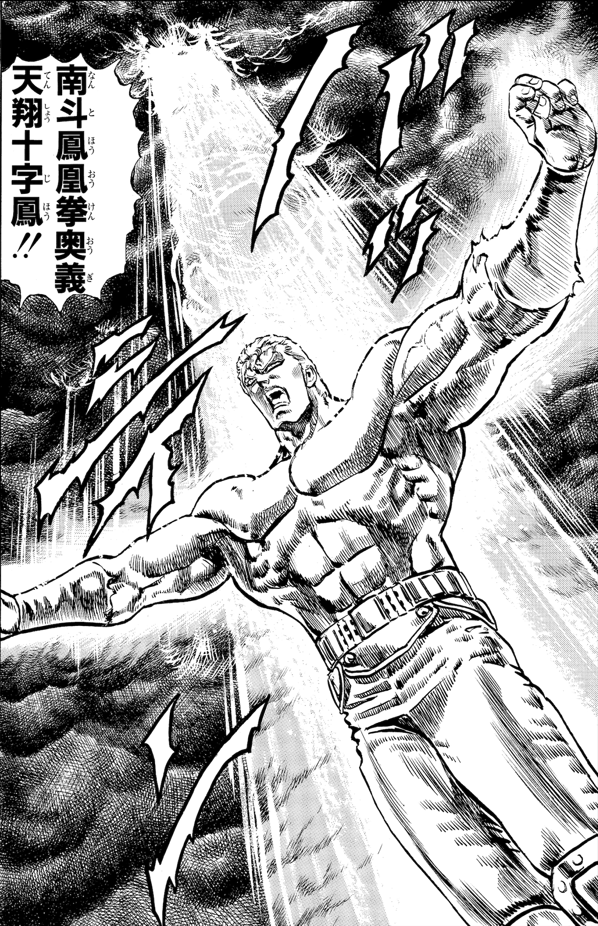 南斗鳳凰拳の奥義。自らの体を天空に舞う羽根と化し、相手の技の流れを見切り、空を切らせ躱しつつ攻撃を行う。南斗鳳凰拳には本来、防御の姿勢である「構え」を一切持たないが、対等の敵が現れた時には、帝王の威信を賭け、天翔十字鳳の「構え」をとる。