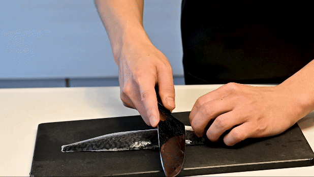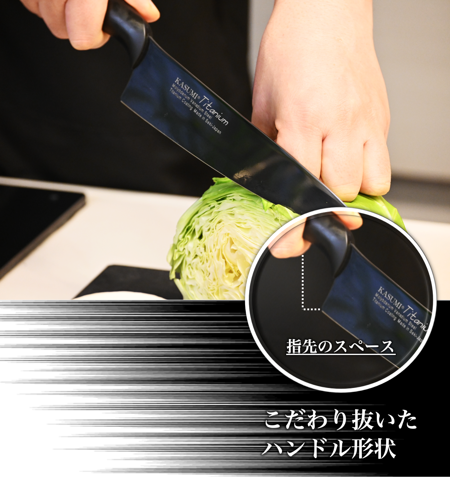 スミカマの包丁「霞シリーズ」は、ハンドルから刀身まで反り上がる仕様となっています。独自の高い位置にあるハンドルにより、まな板に手が当たることなく、力強くスムーズに包丁を振ることができます。