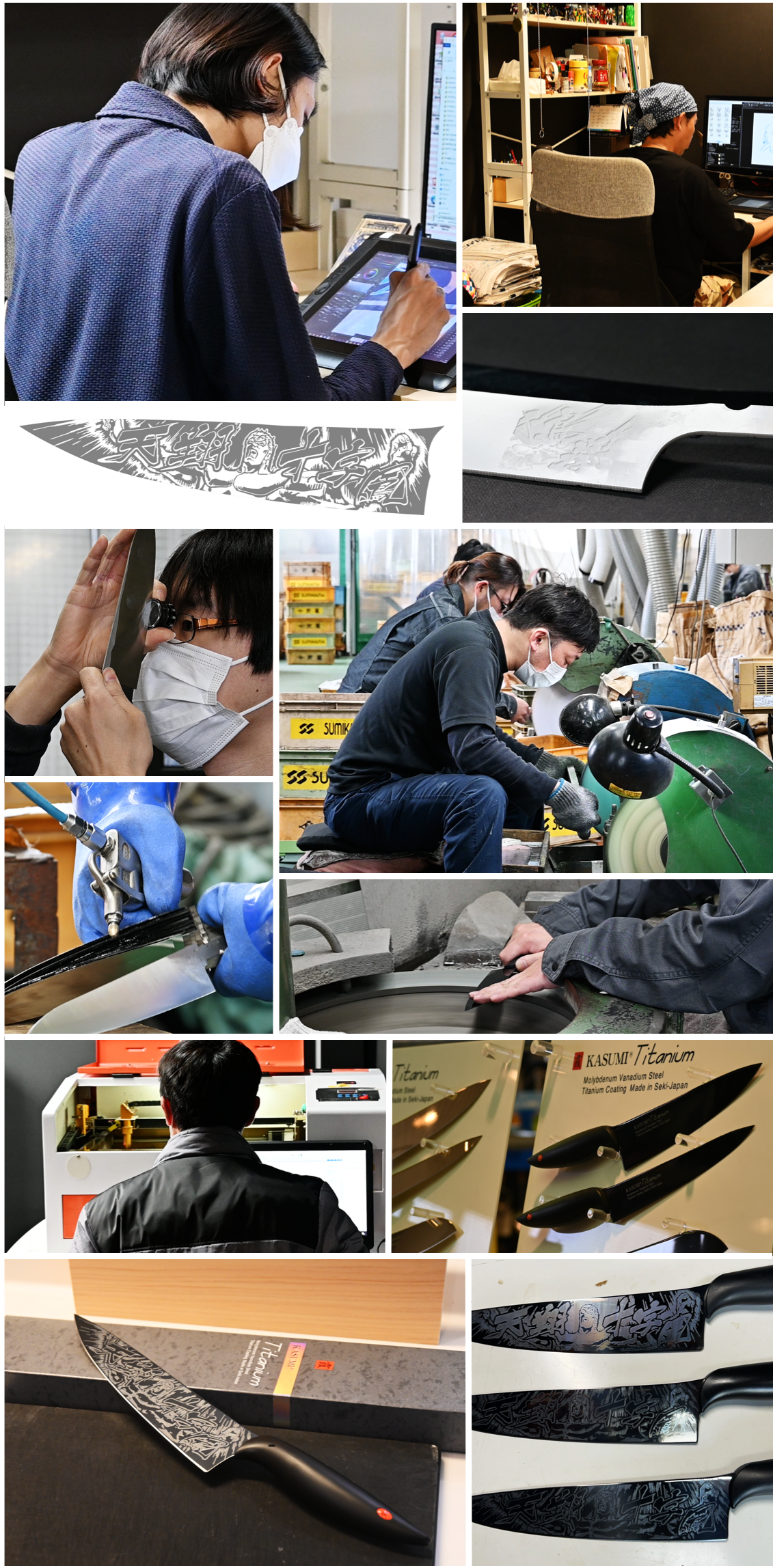 私たちのチームは、日本の伝統製品の魅力をもっと多くの人に体験してもらいたいという情熱のもと集いました。北斗の拳の版元様や老舗包丁メーカーであるスミカマ様に限らず、幾つものアイディアを出し合ってくれたデザインオフィスや、何度も試作をしてくれたレーザープリント工場など、様々な方達のご協力の元、開発に至ります。