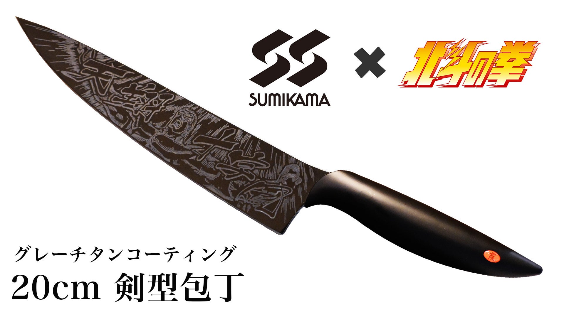 創業100年を超える職人技術を駆使した高い機能性を持つ全長34cm(刃渡り20cm)の万能剣型包丁に、北斗の拳の人気キャラクター『サウザー』をデザインしています。灰色の特殊なチタンコーティングを施した切れ味抜群の包丁は、「観ても使っても楽しい」遊び心満載の逸品です。