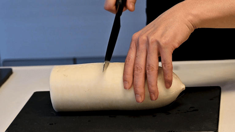 刃は反りながらカーブしており、食材に対して長い時間刃先が当たるのが特徴で、主に引き切りに適しています。