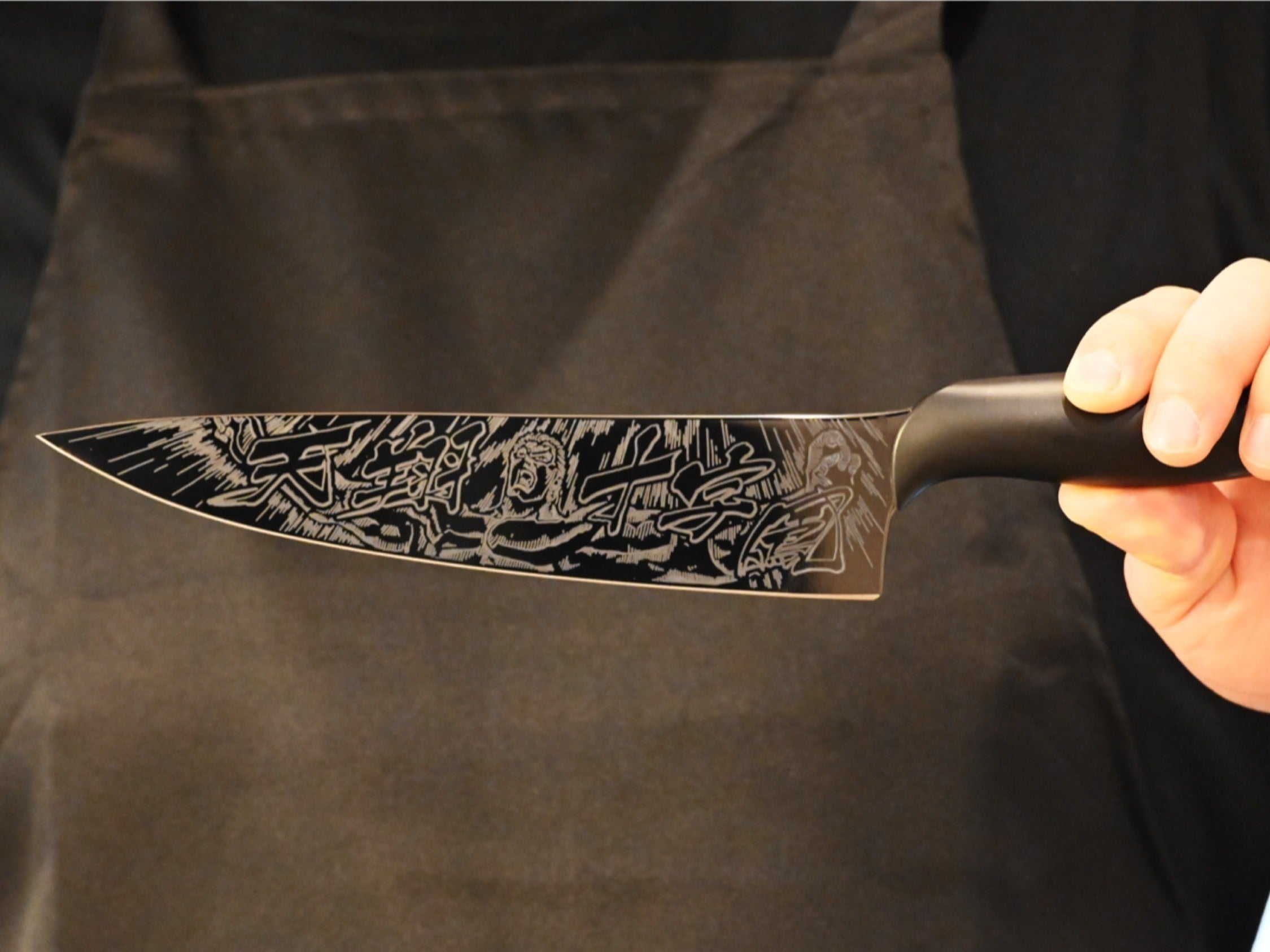 灰色の刀身に刻まれたサウザーのデザインは、高速レーザー技術を駆使して、1本あたり1時間近くの時間をかけることで、きめ細やかさ且つダイナミックさを表現しています。