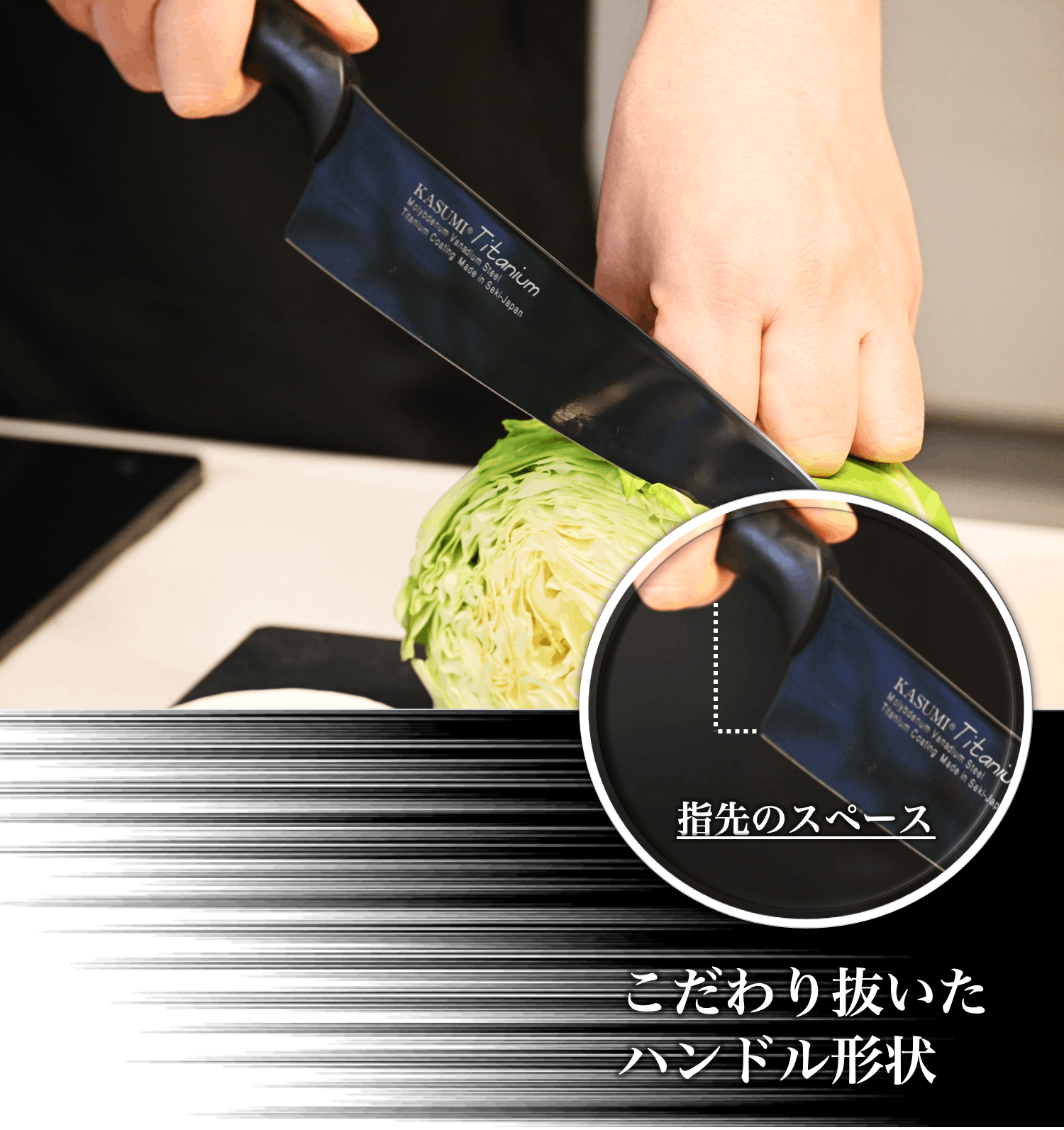 また、耐摩耗性に優れたチタンコーティングが、包丁の寿命を延ばし、錆を防止します。