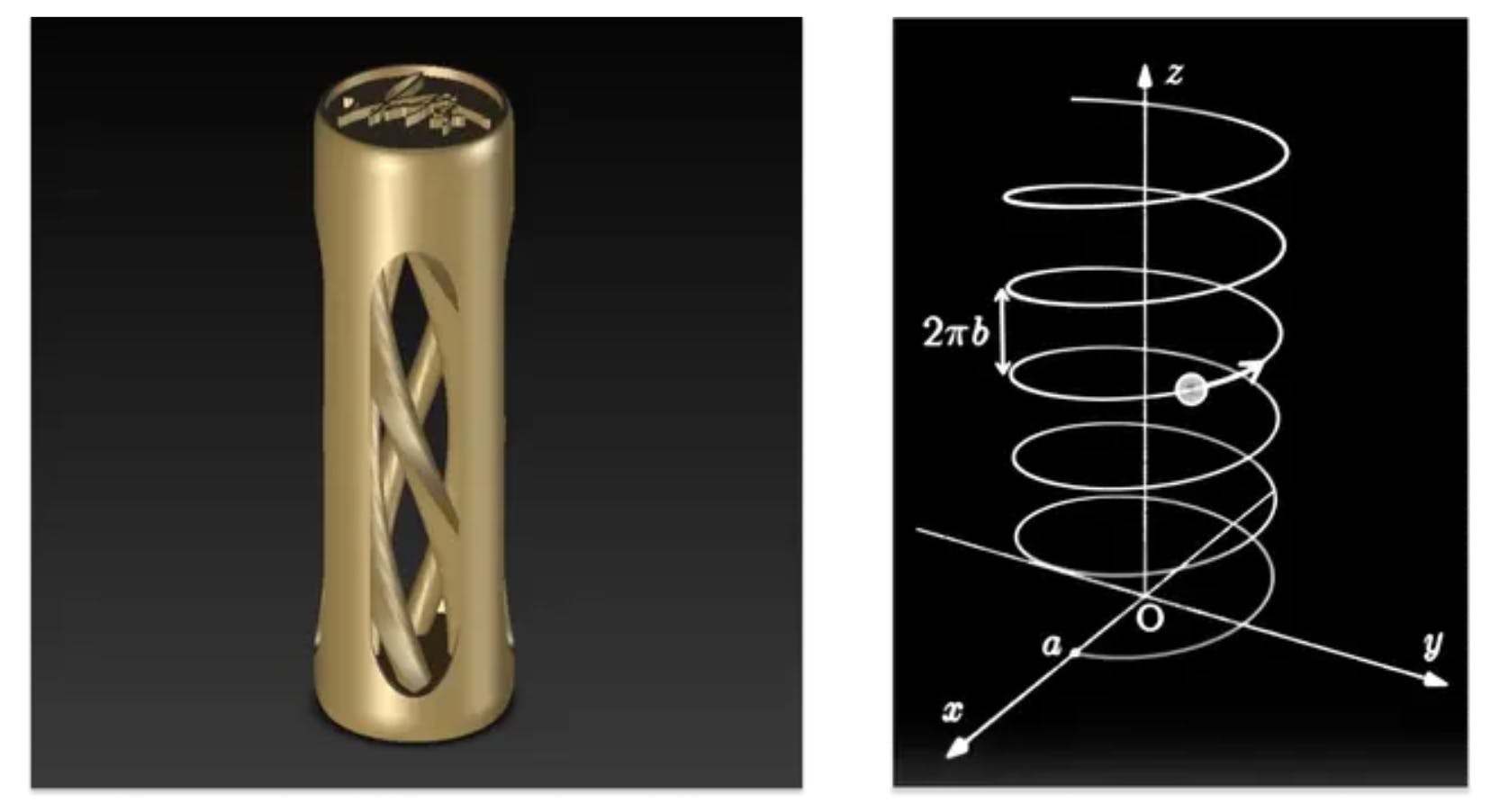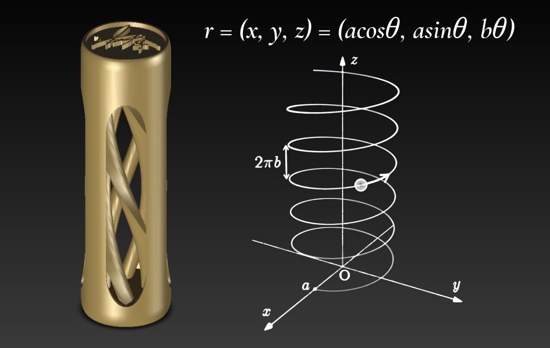 r = (x, y, z) = (acosθ, asinθ, bθ) に基づいて設計しており、螺旋の柱の断面が雫型になったことで、光を当てると柱の中央に一本の筋が浮かび上がるようになりました。