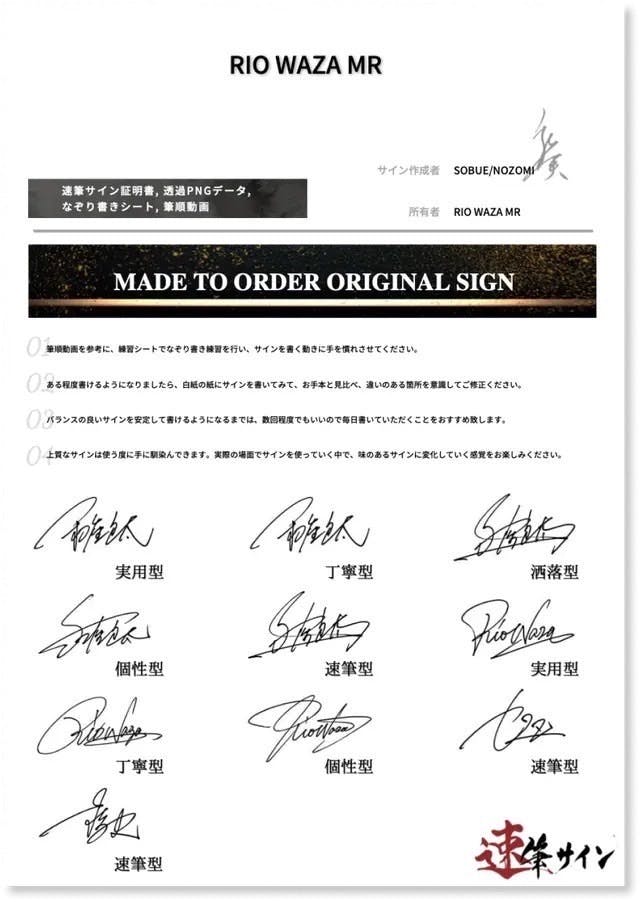 あなたのオリジナルサインが速筆サインのものであることを証明する速筆サイン証明書。