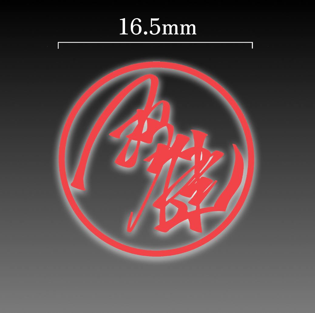 認印では比較的安価に製作できる直径12mmほどのハンコがよく用いられ、実印は13.5-18mmほどで作られることが多いのですが、今回は書道家直筆サインが活きるよう、インパクトがありながらも悪目立ちしない16.5mmを印面の大きさとしました。